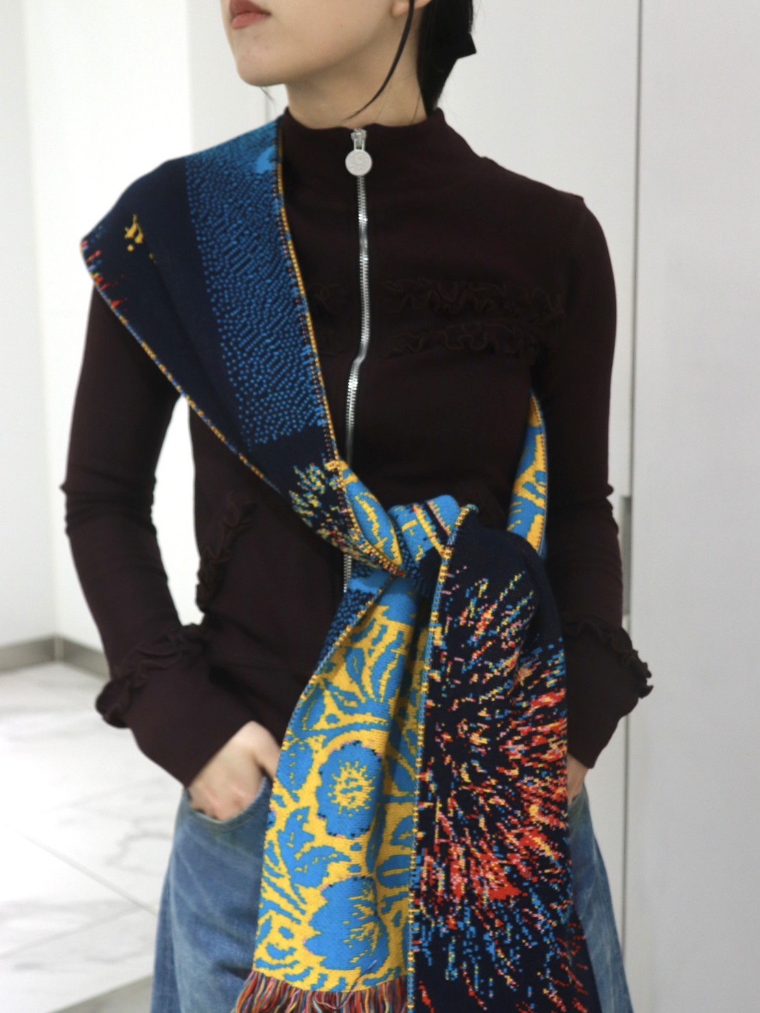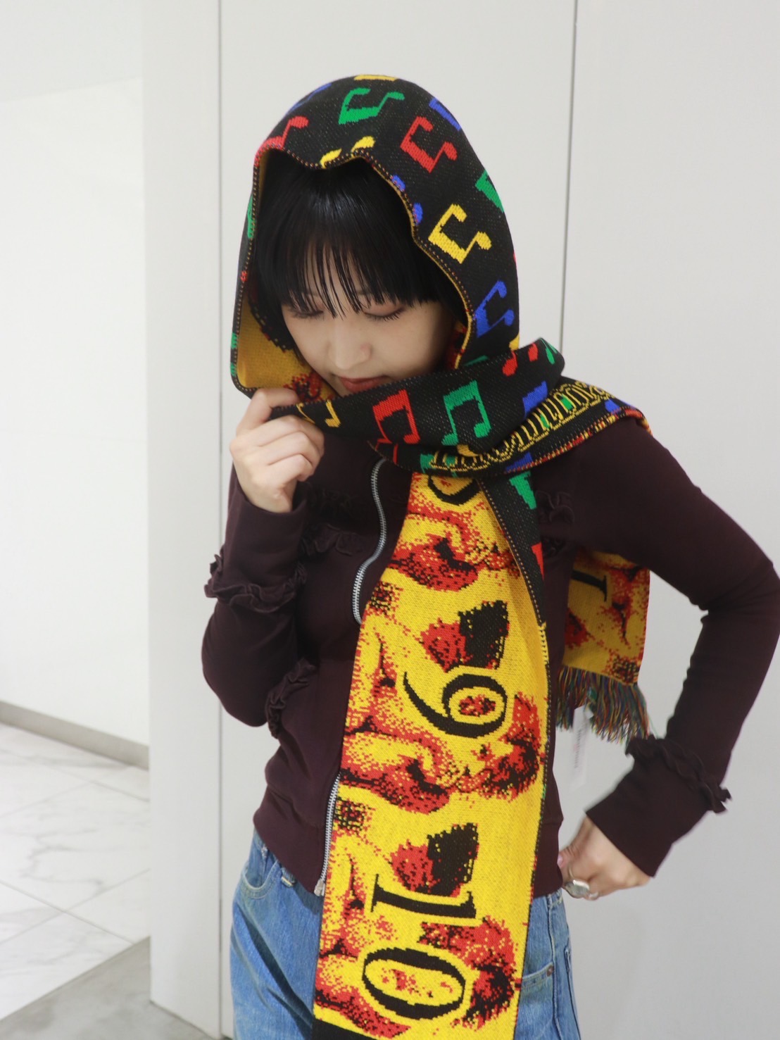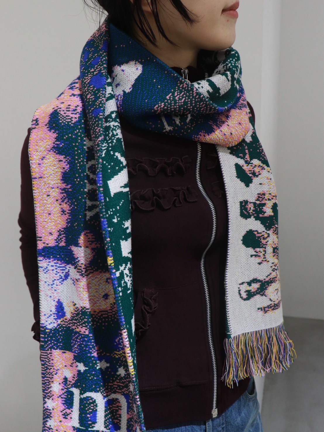 マフラーの揺れ感と動くたびに見えるフーディーのフリルが華やかな雰囲気です。