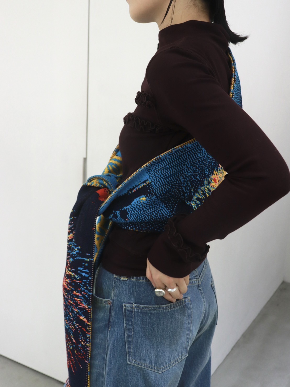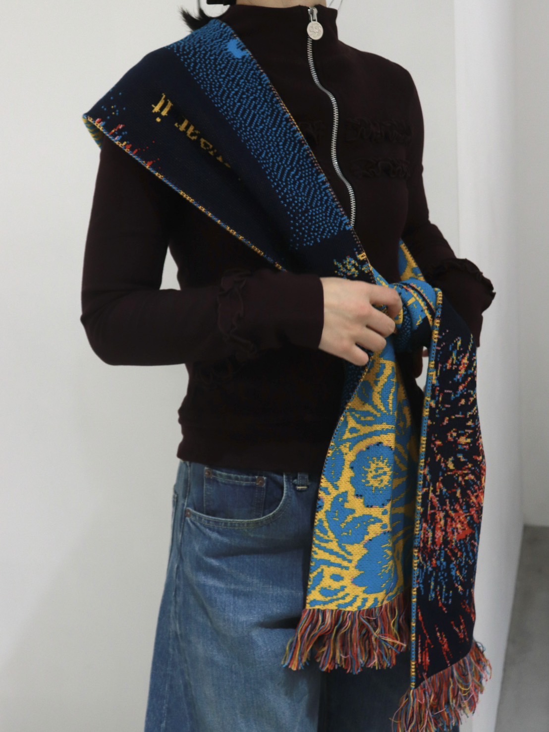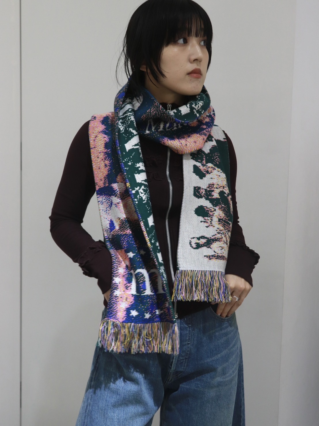 マフラーとして首に巻くのは勿論、たすき掛けのようにスタイリングのアクセントにも。