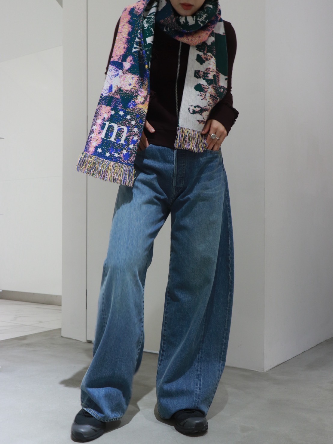 首元にはマフラーを合わせアクセントをプラス。