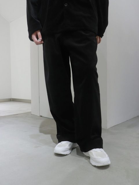 パンツはワイドストレートで落ち感があり、動くたびに美しいドレープを生み出します。