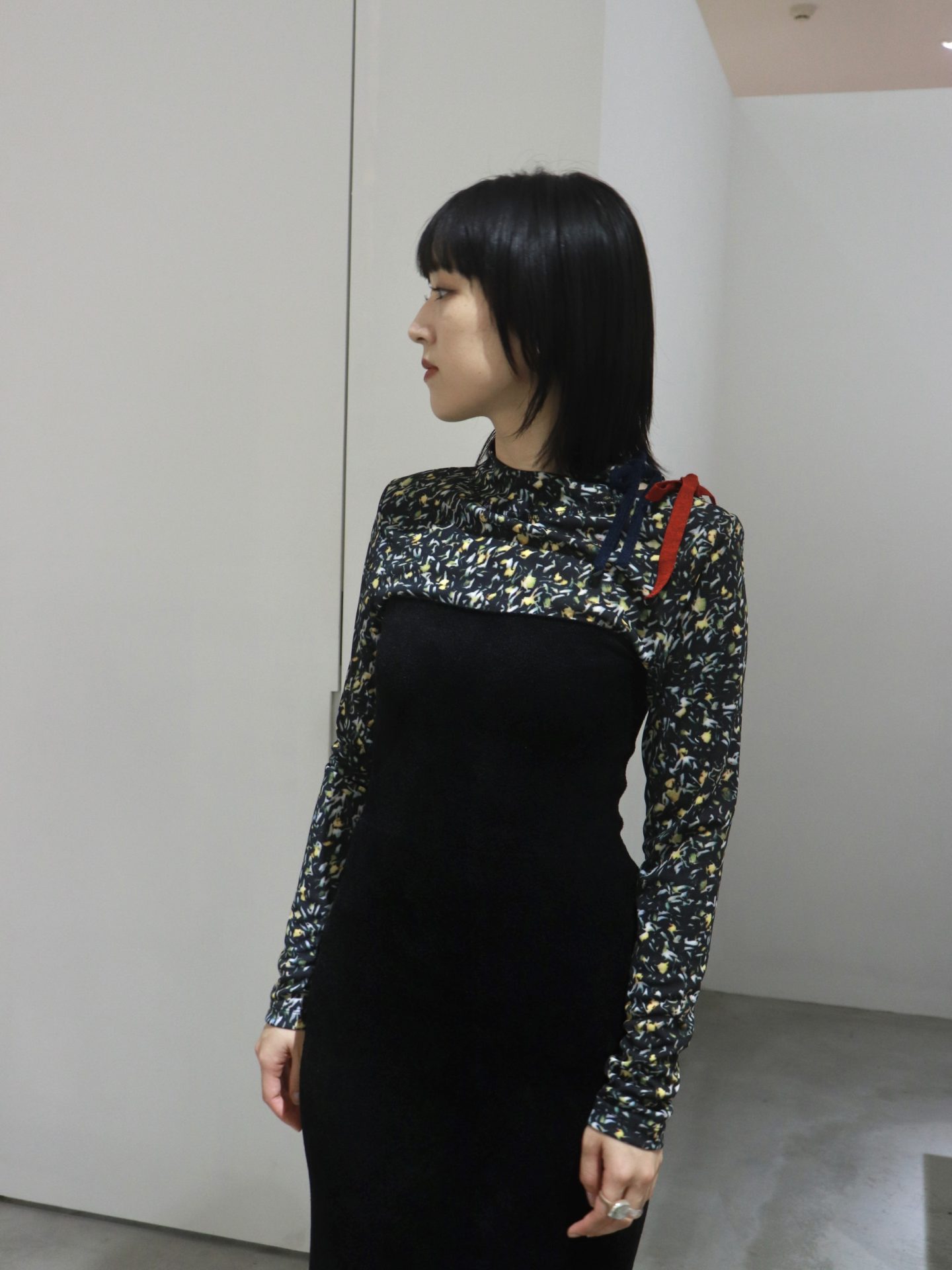 肩の異素材リボンがさりげないアクセントとなり、女性らしさを引き立てます。