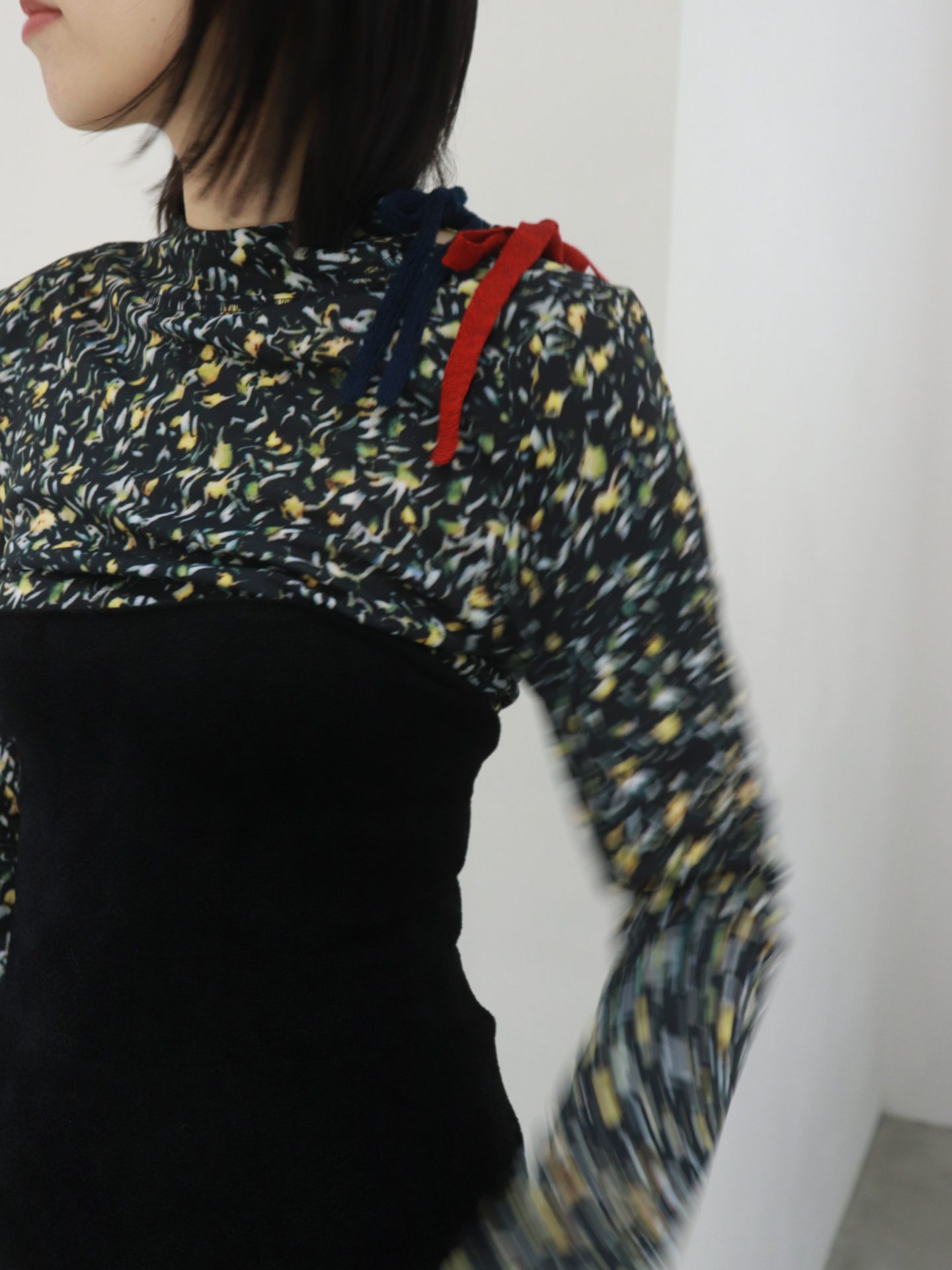 アンティーク調の小花柄とマーブル模様が混ざり合うロングスリーブカットソーは、1枚で印象的な存在感を放つアイテム。