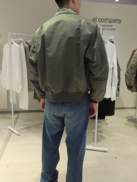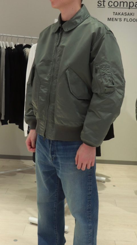 U.S.A. FCWU-45/P FLIGHT JACKETをベースにしたジャケットは、ビッグシルエットと艶のある素材感が特徴。