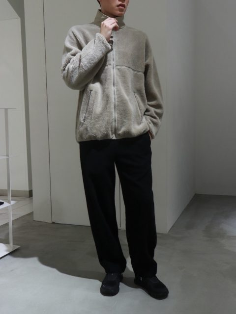 パンツにはウールカシミヤフリースで製作したイージートラウザーズ。