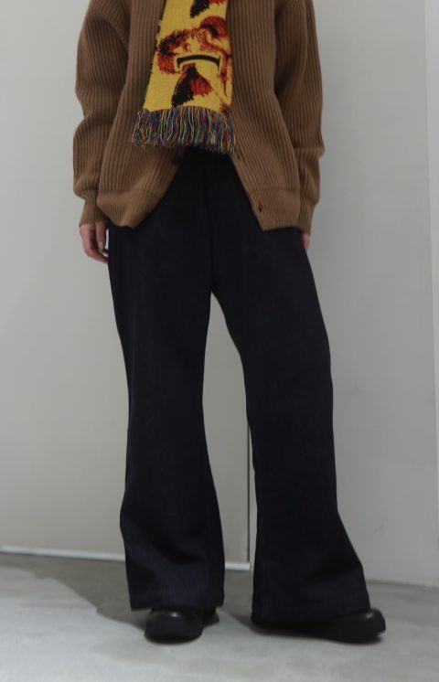 少し裾がフレアシルエットが特徴のインディゴデニムパンツ。
