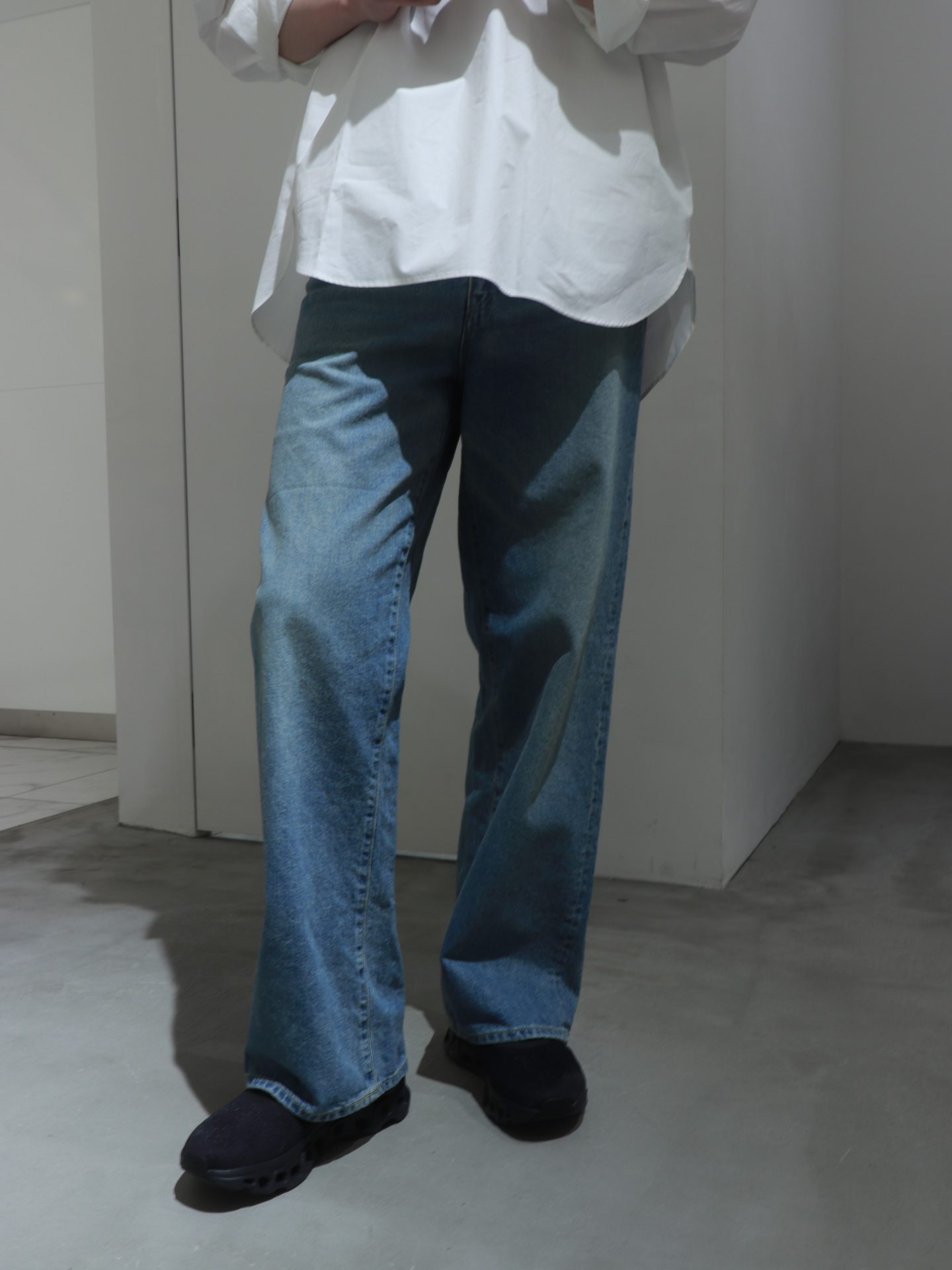 足元にはデニムとの相性が良いOnのCloudmonsterを合わせ、シンプルでカジュアルなスタイリングに仕上げました。