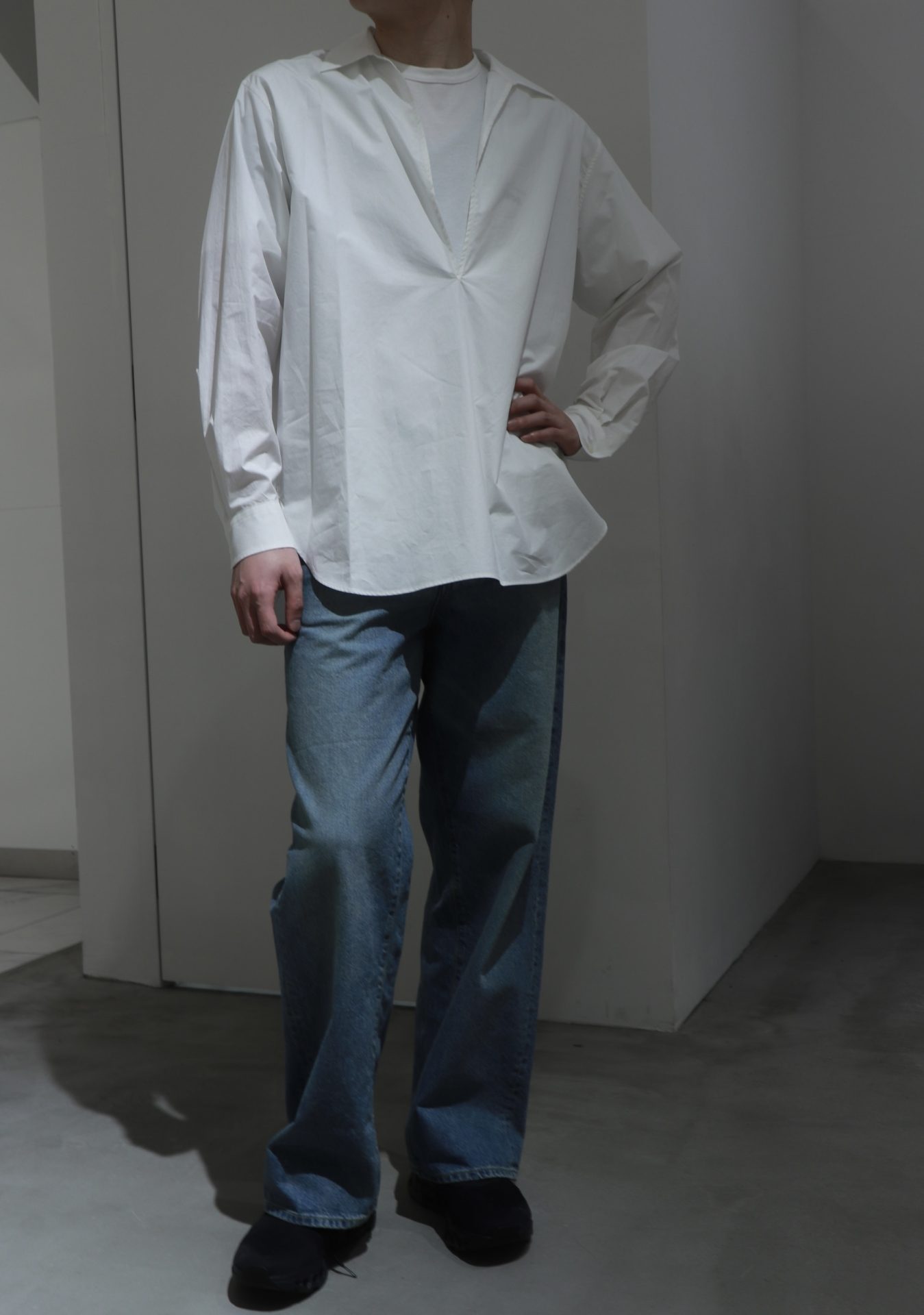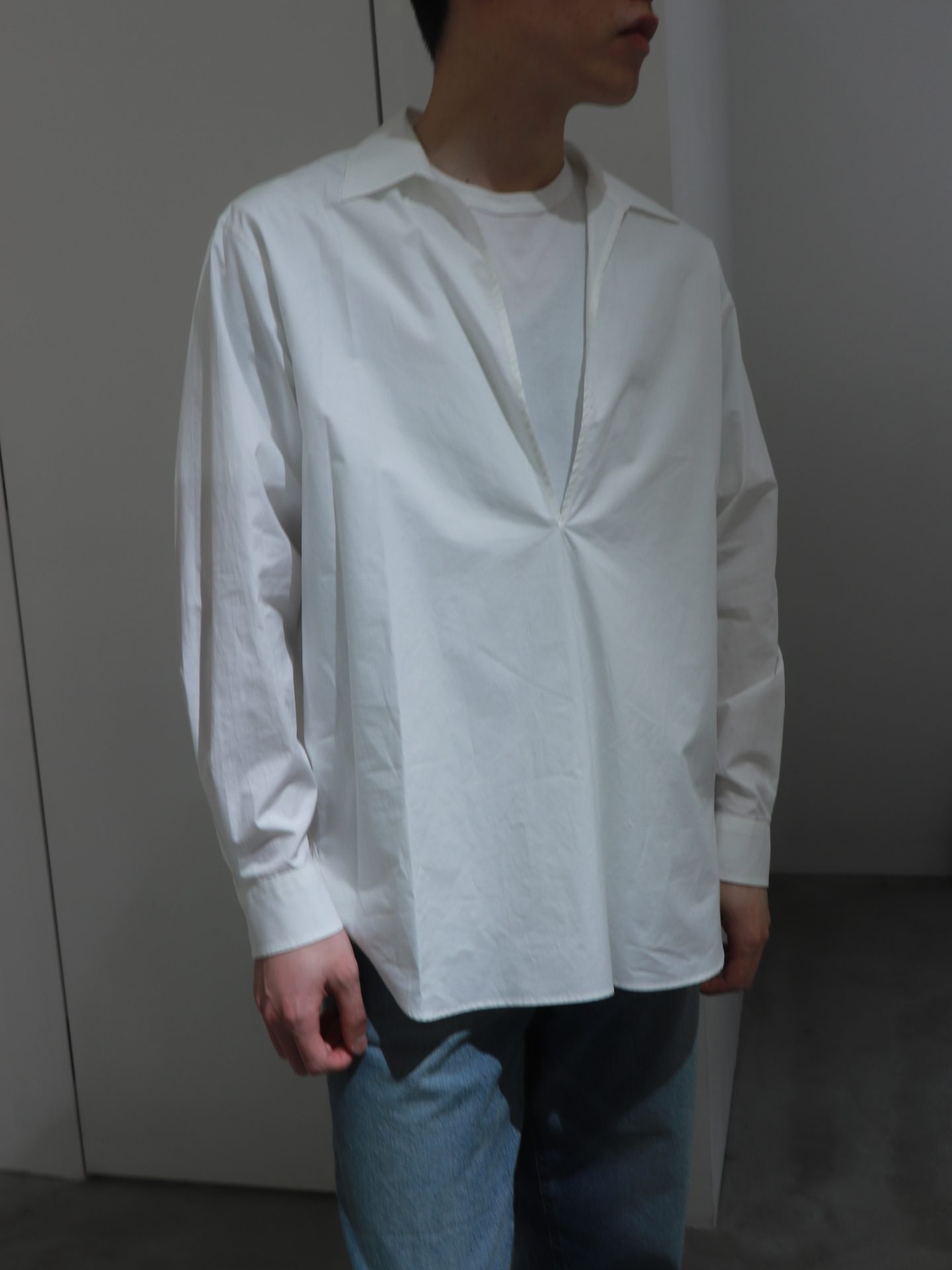 深めの前開きが印象的な、ミニマルデザインのスキッパーシャツ。