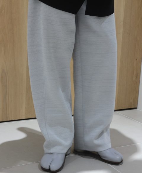 合わせたのはミラノリブのしっかりした編地とピンタックデザインが入ったバックポケットがポイントのワイドパンツ。