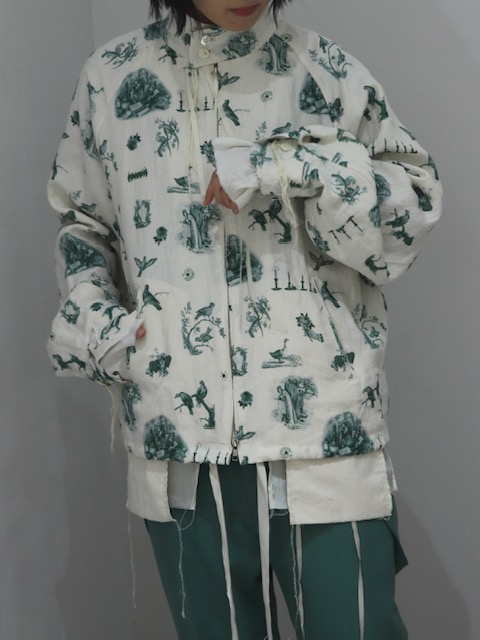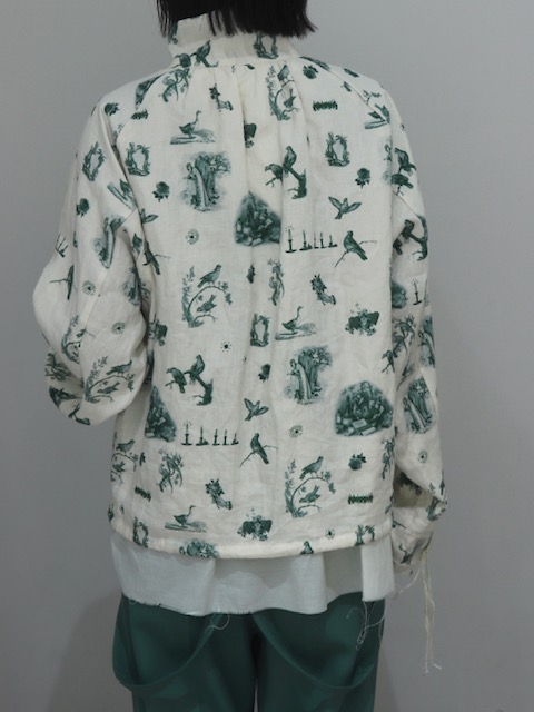 生成りのリネン生地にアンティーク調のトワルドジュイを思わせる総柄プリント。