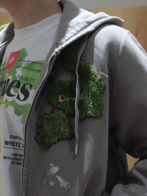 苔をモチーフにした繊細な刺繍が全体に施された、アーティスティックなフーディー。自然の生命力を感じさせるオーガニックなデザインが特徴です。