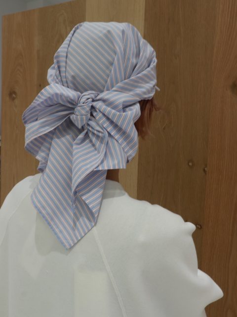 シャツ生地の様な斬新なデザインのスカーフキャップ。