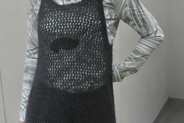 ノースリーブのトレンチコートをドレスの様に着こなしたスタイリング。