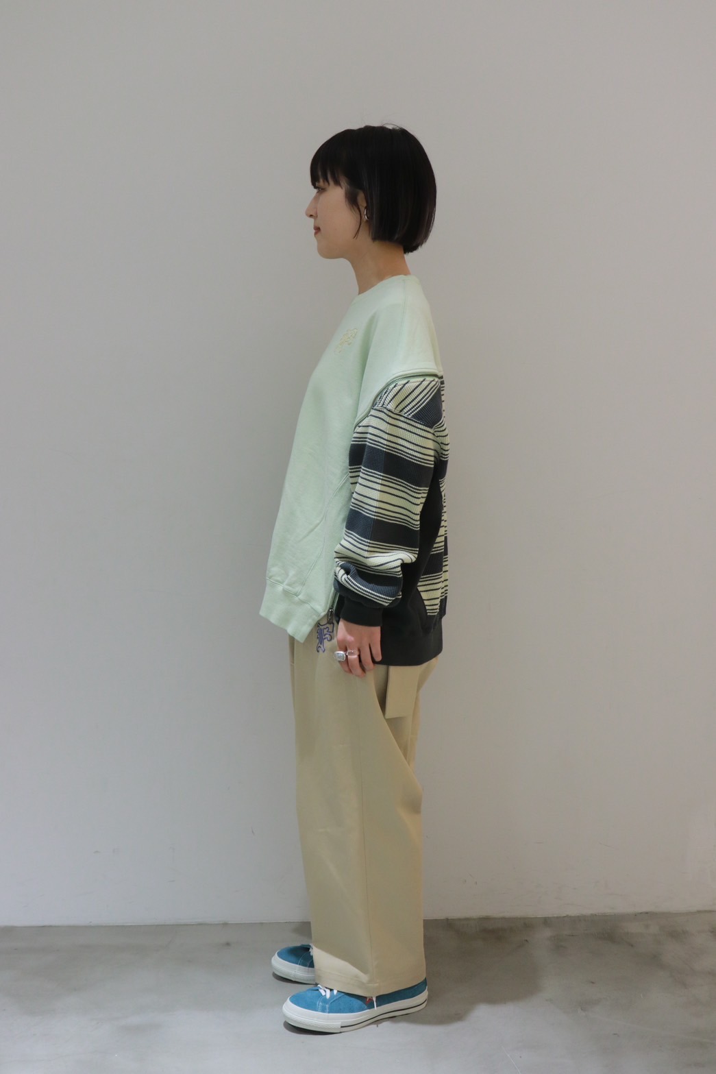ボトムにはBLESS定番のジョガーパンツとデニムがドッキングされたパンツを合わせ、ユニークさをプラス。