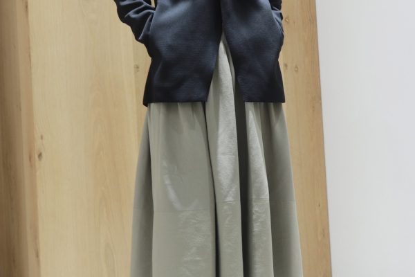 背中部分にファスナーが付いているため、開けることでインナーを見せるスタイリングに。