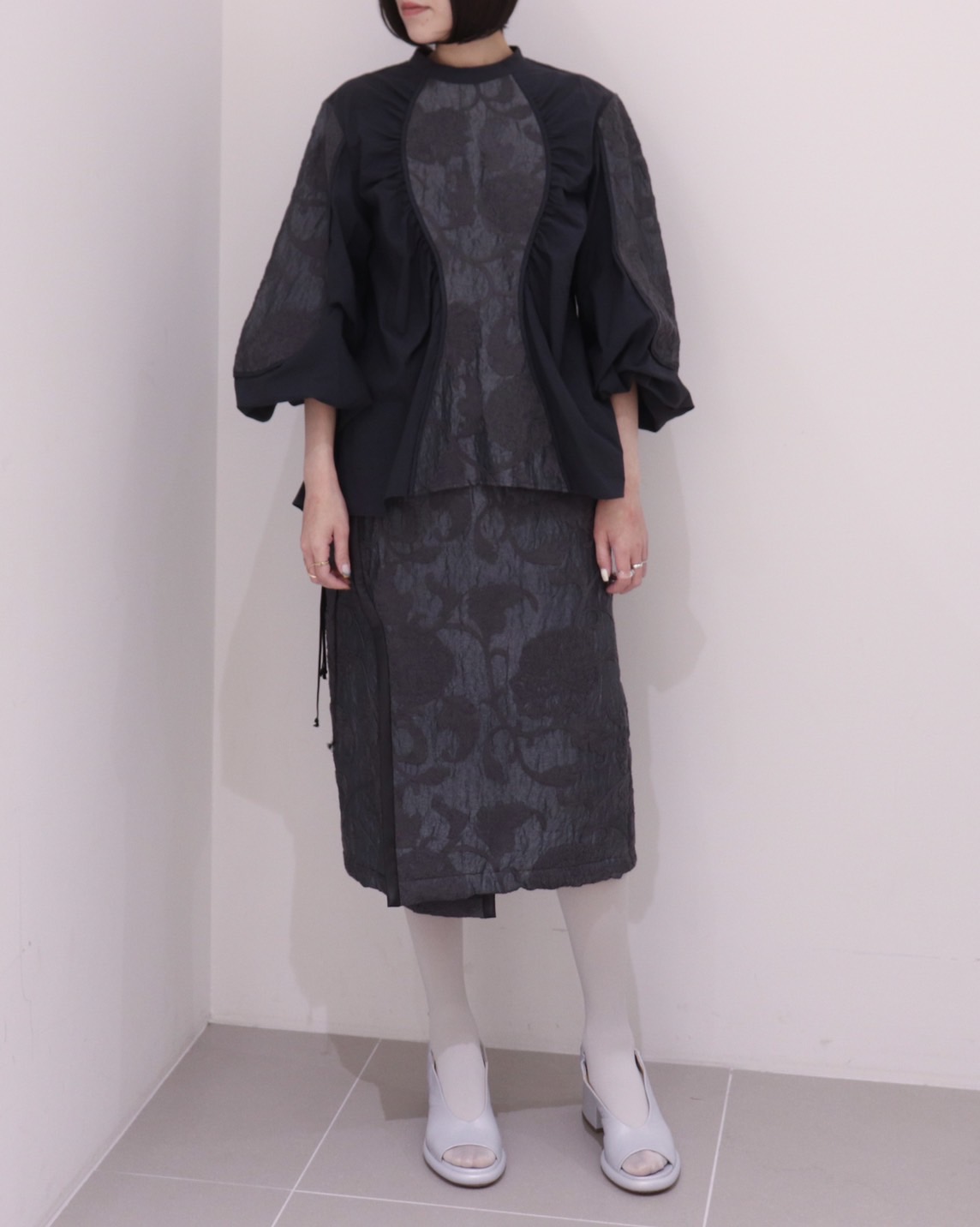 ブラウスと同素材の刺繍が美しいラップスカートは中綿が入っており、秋冬でもスカートスタイルがお楽しみいただける1着です。