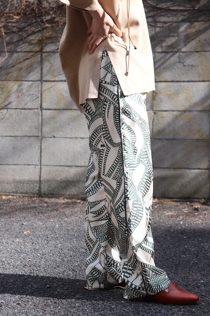 ウエストにはゴムが配されリラクシーな着用感ながらも、光沢感のある生地を使用しておりスタイリングの主役として着用頂けます。