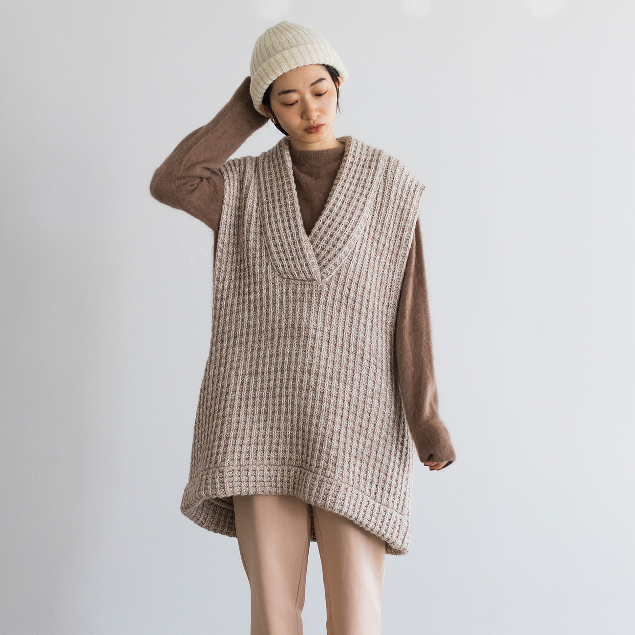 アルパカウールのニットベストは一点もののような佇まい。