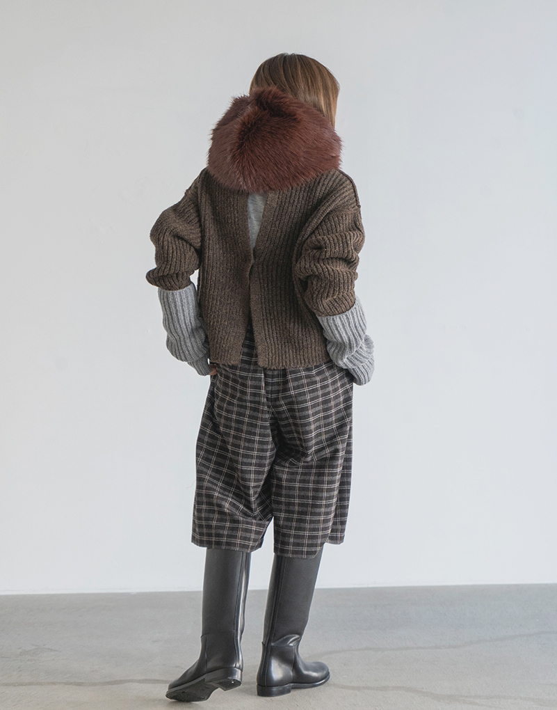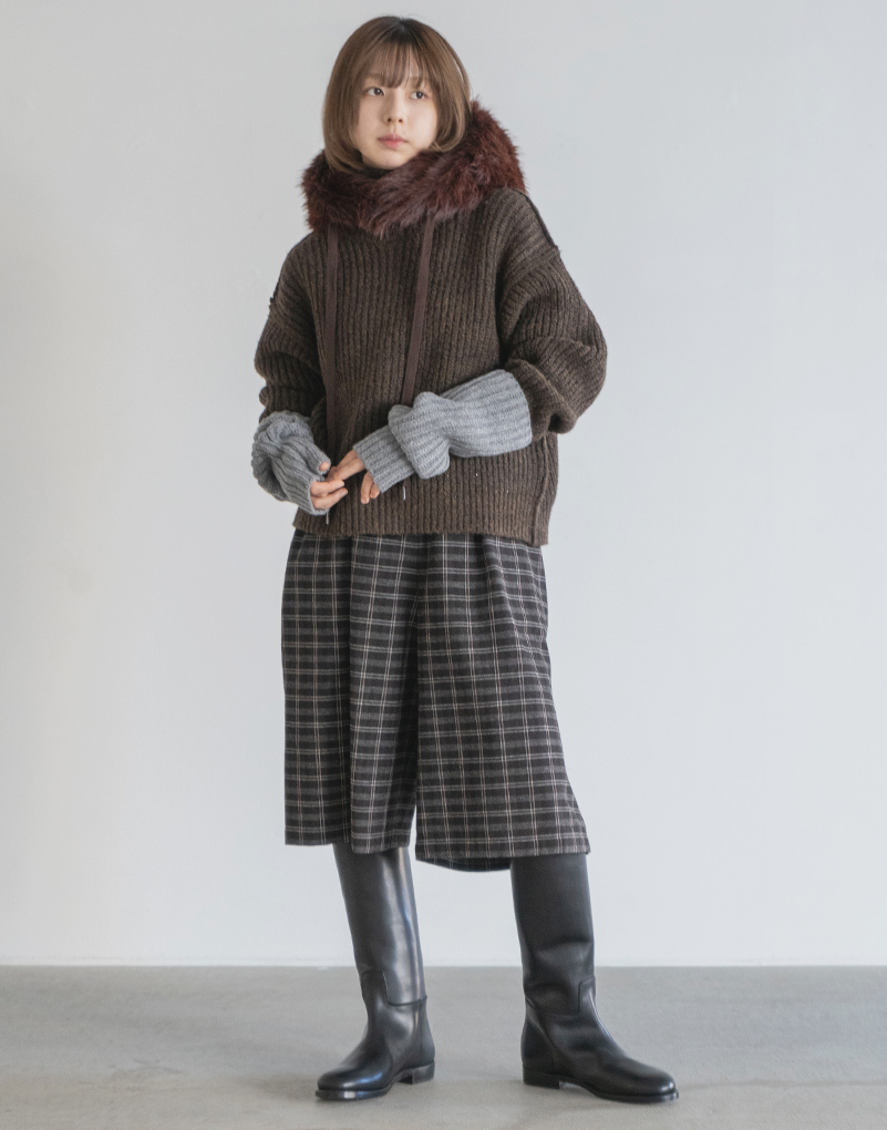 Chika Kisadaのニットは前後で切れる優秀ニット。思わず触りたくなるファーのバラクラバと合わせれば、バッグスタイルまで抜かりなし。