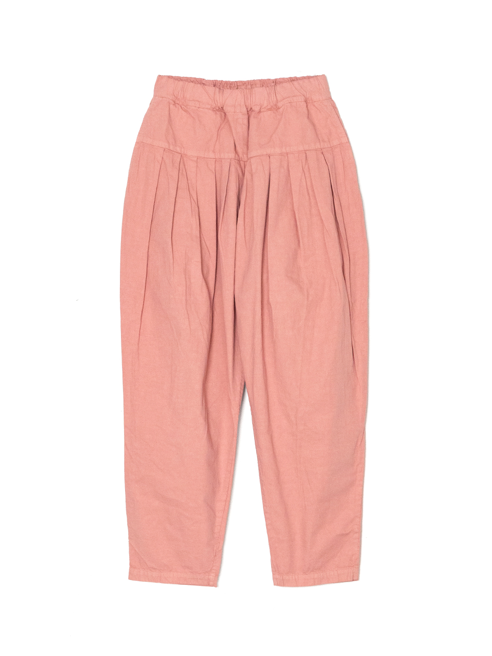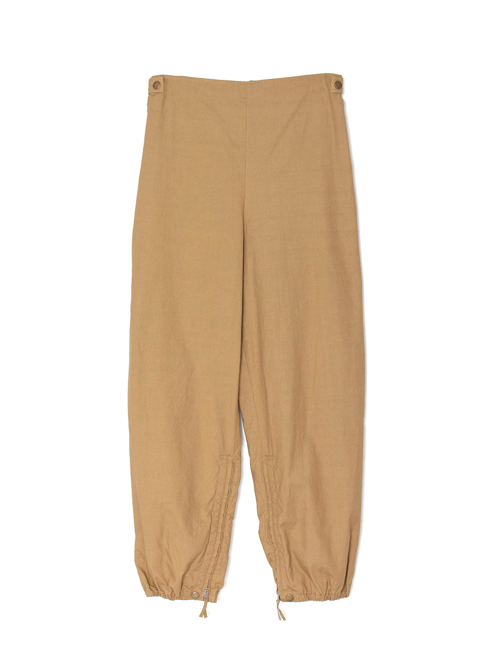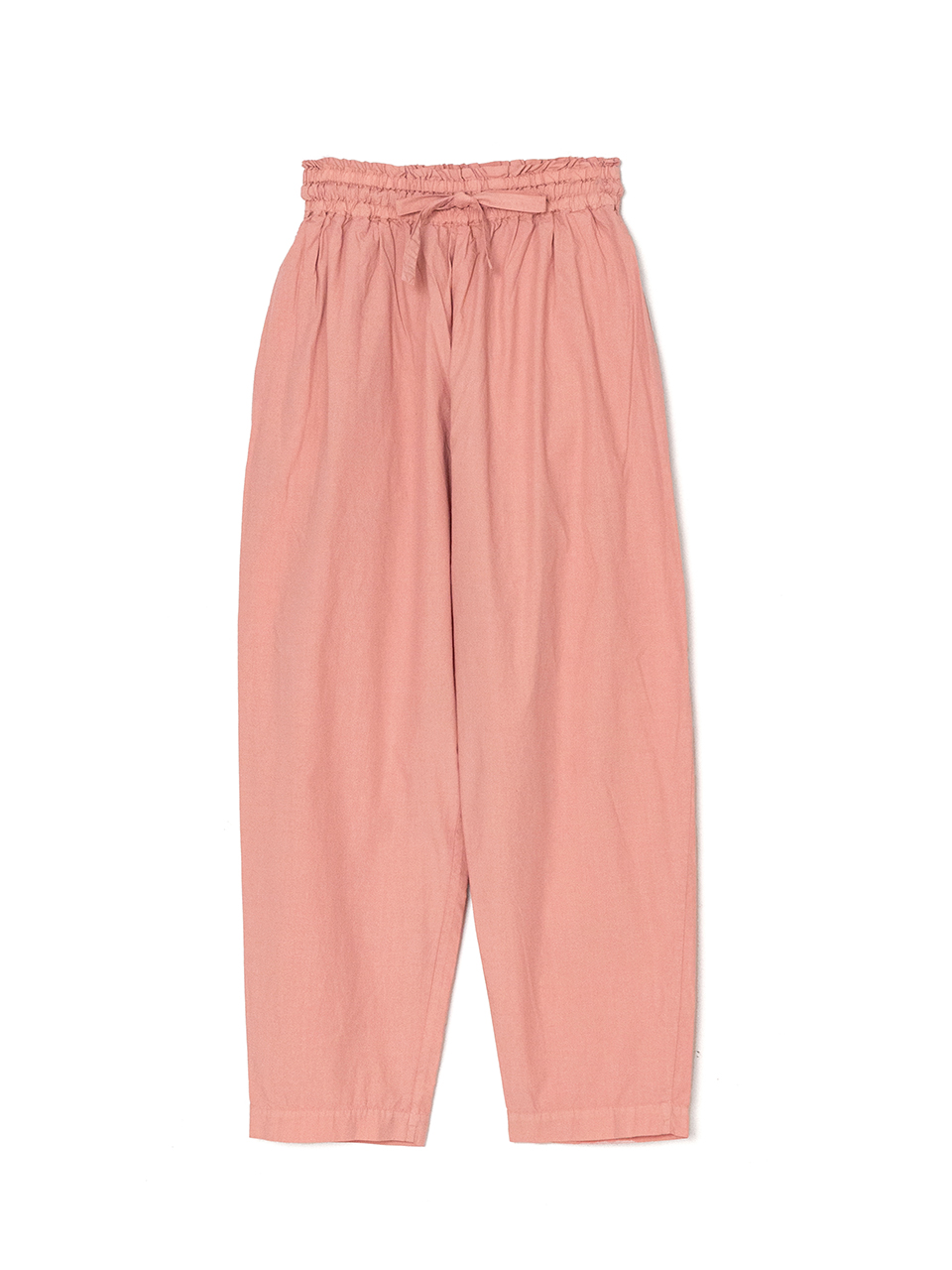 デイリーユースに最適なバックサテン素材のバレルパンツ。