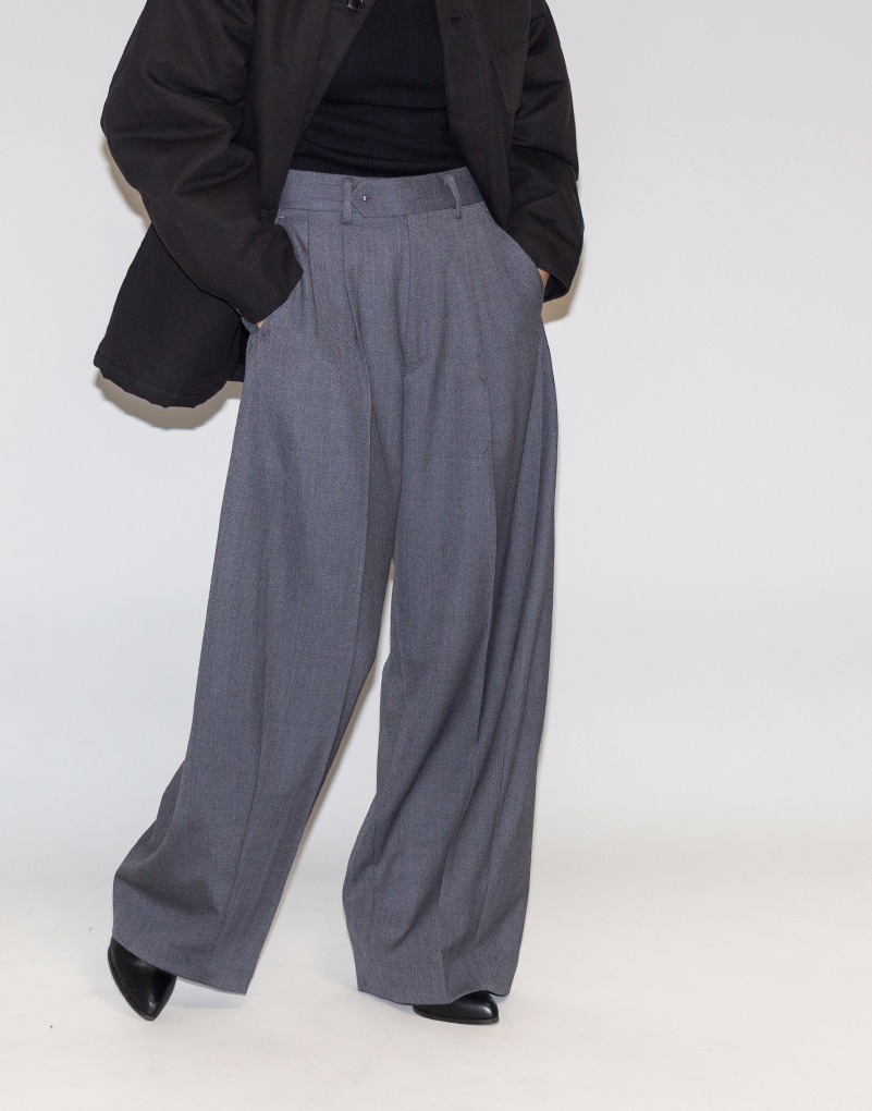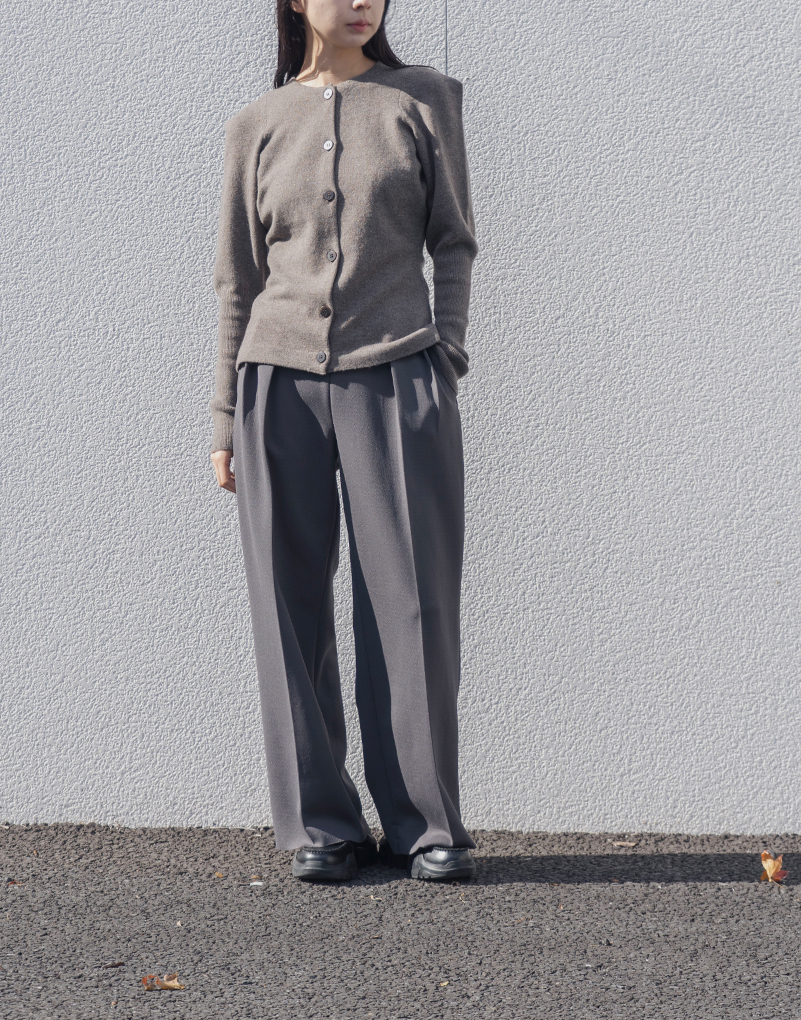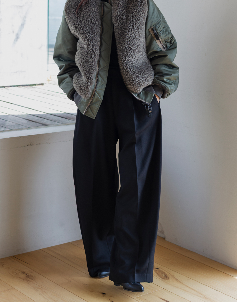 ウールとポリエステルが使用され、バレルシルエットの中でもドライな風合いが特徴のアイテム。