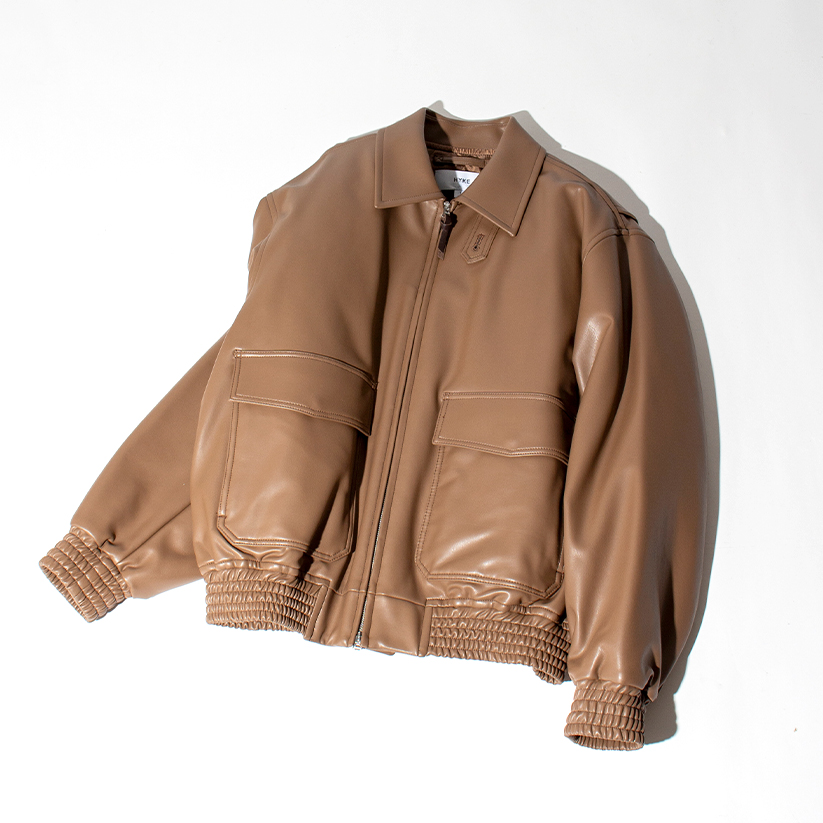 FAUX-LEATHERだからこそ出せる優しいお色味と無骨な印象のレザージャケットをよりレディな仕上がりに。