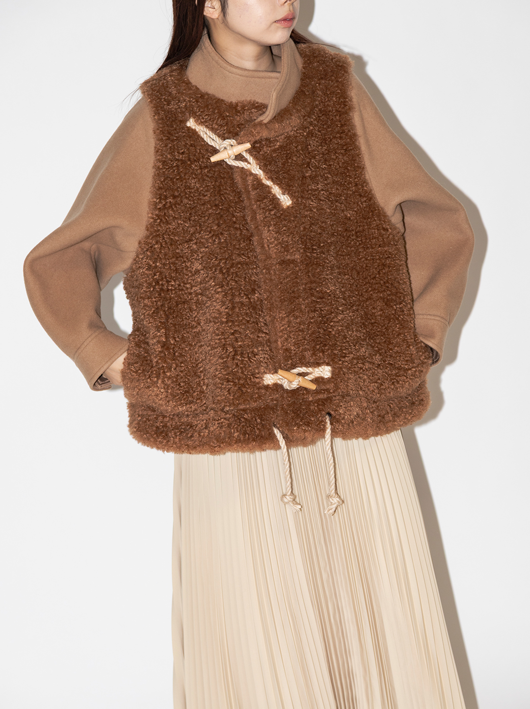 HYKE人気シリーズであるトグルのデザインに、女性らしいボアの温もりがプラスされた”カジュアル×エレガント”なアウター。