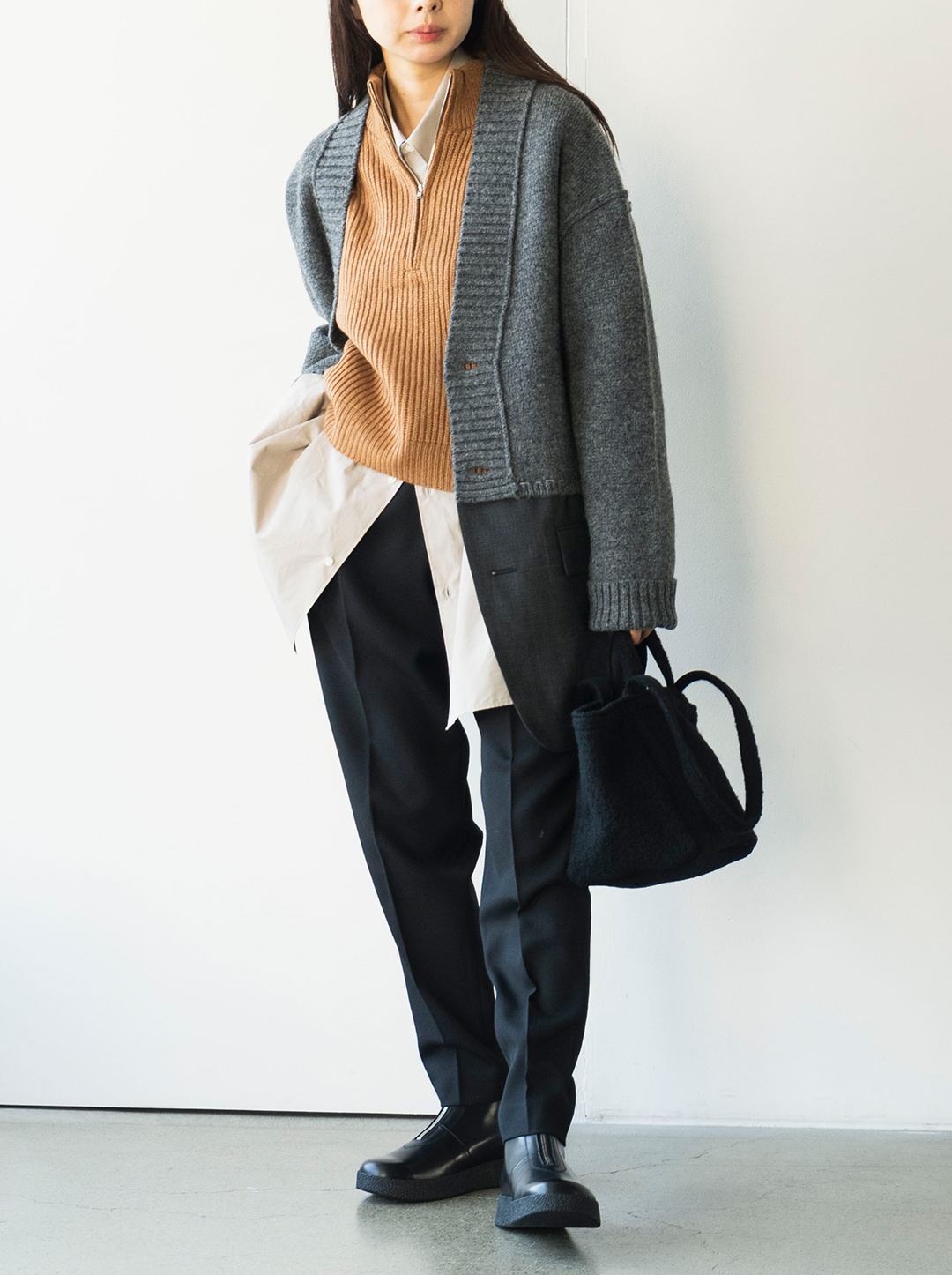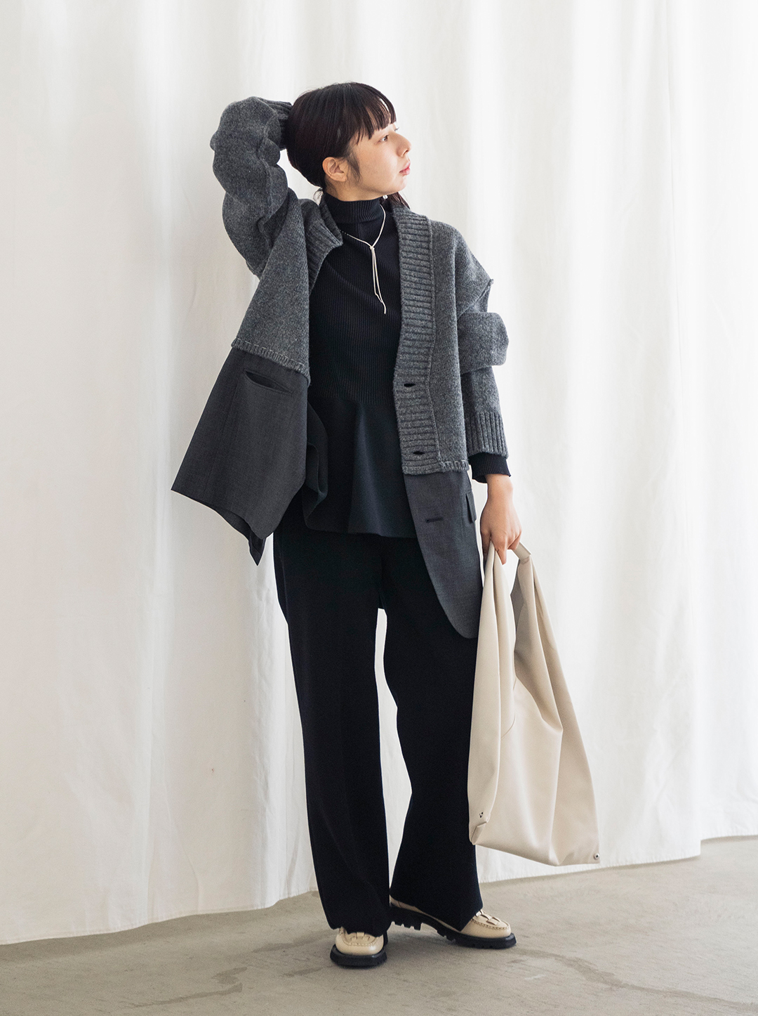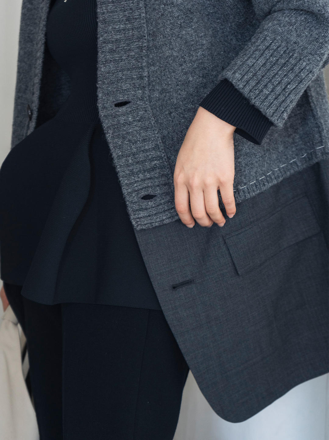 ポイントはやっぱりカーディガンとジャケットを組み合わせたユニークな切り替え!