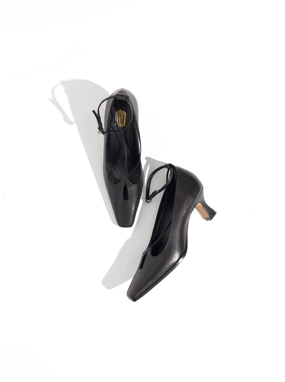 FETICOのカットアウトレザーヒールは控えめながらも上品なカットアウトデザインが特徴で、クロスストラップが、ホールド感のある履き心地を実現します。