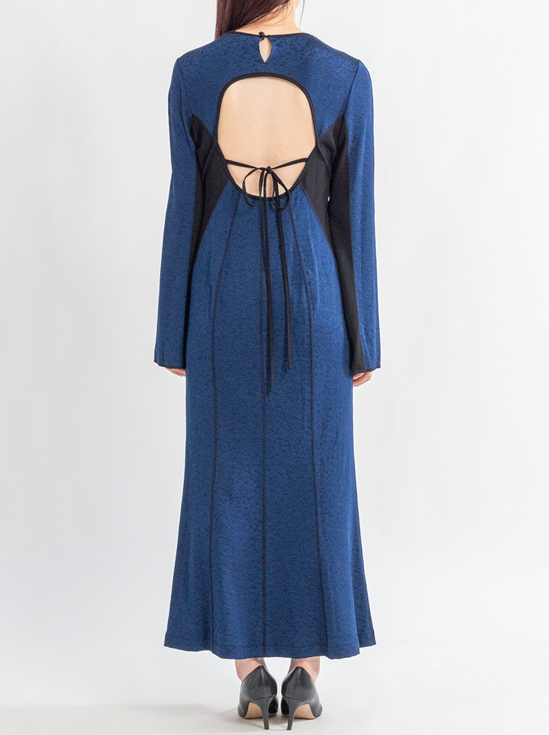 大胆に開いた背中と袖や裾のフレア感が華やかさを演出してくれます。