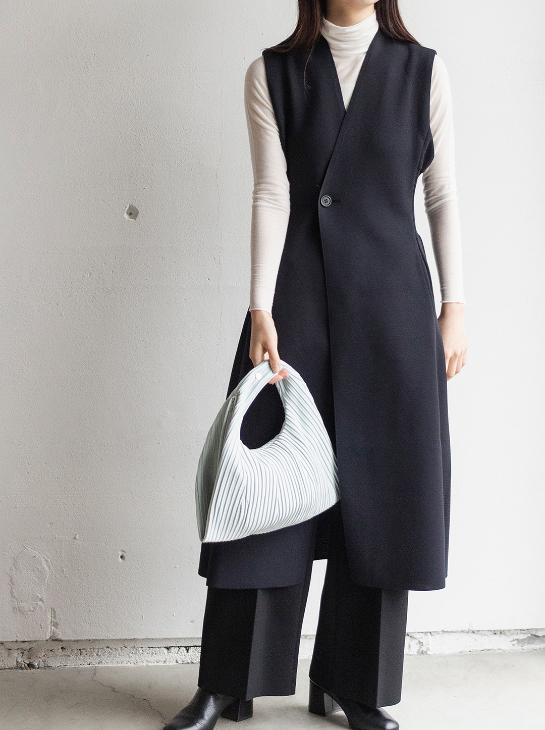 シンプルなスタイルに合わせるだけでアクセントを加えた大人な着こなしの完成です。