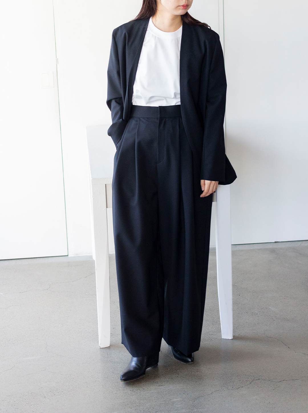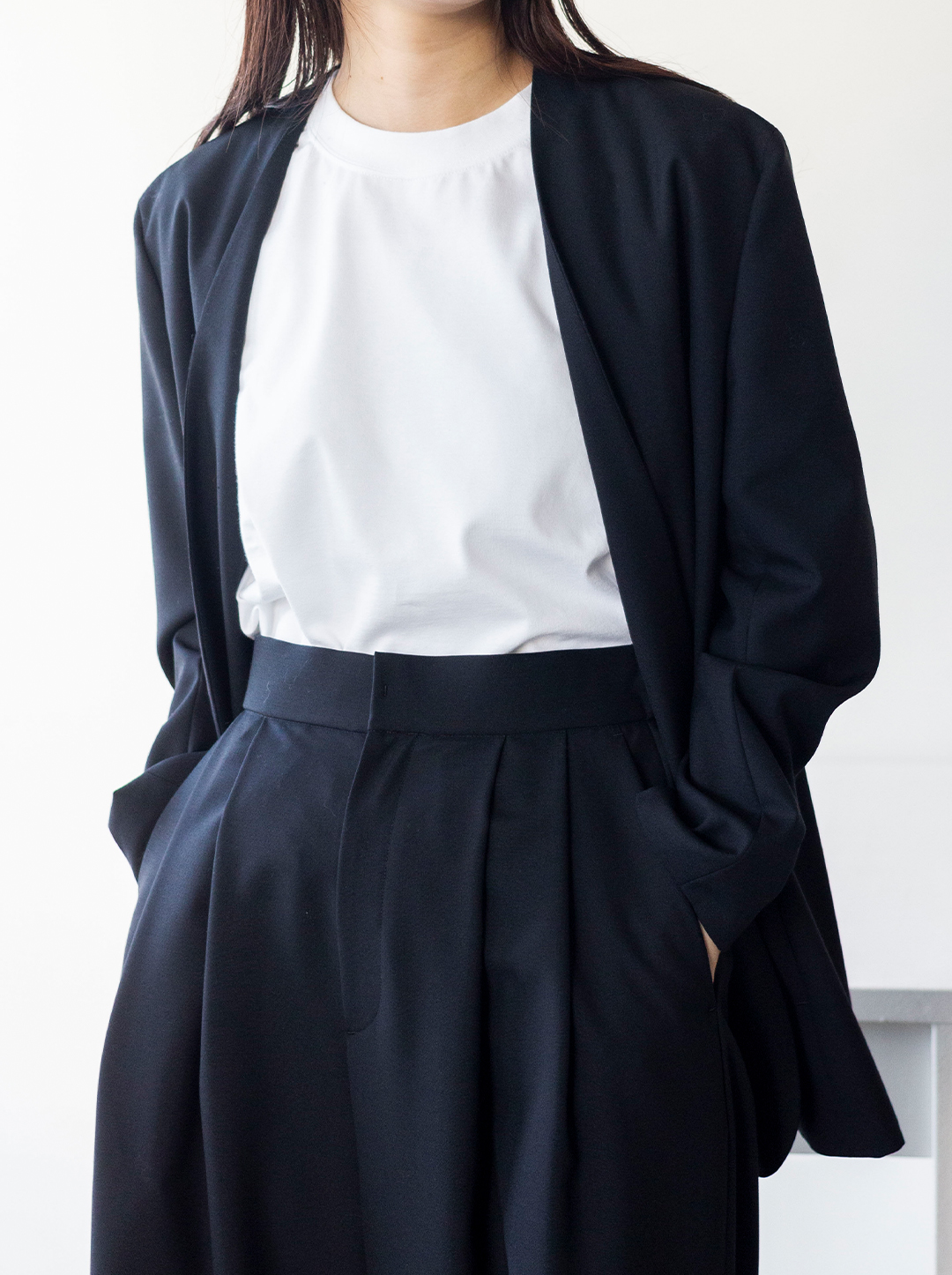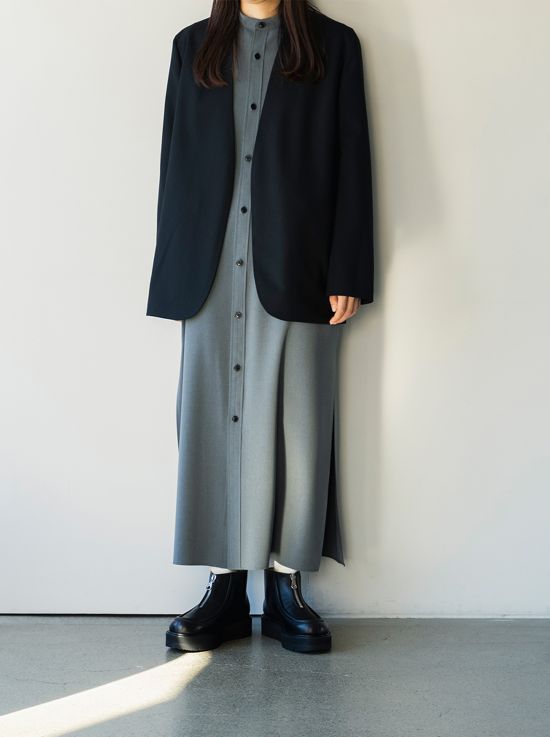 ATONのノーカラージャケットはシルエットがきれいで、顔周りをすっきりみせてくれる頼れる相棒ジャケットです。