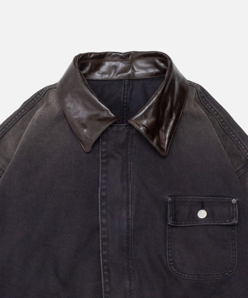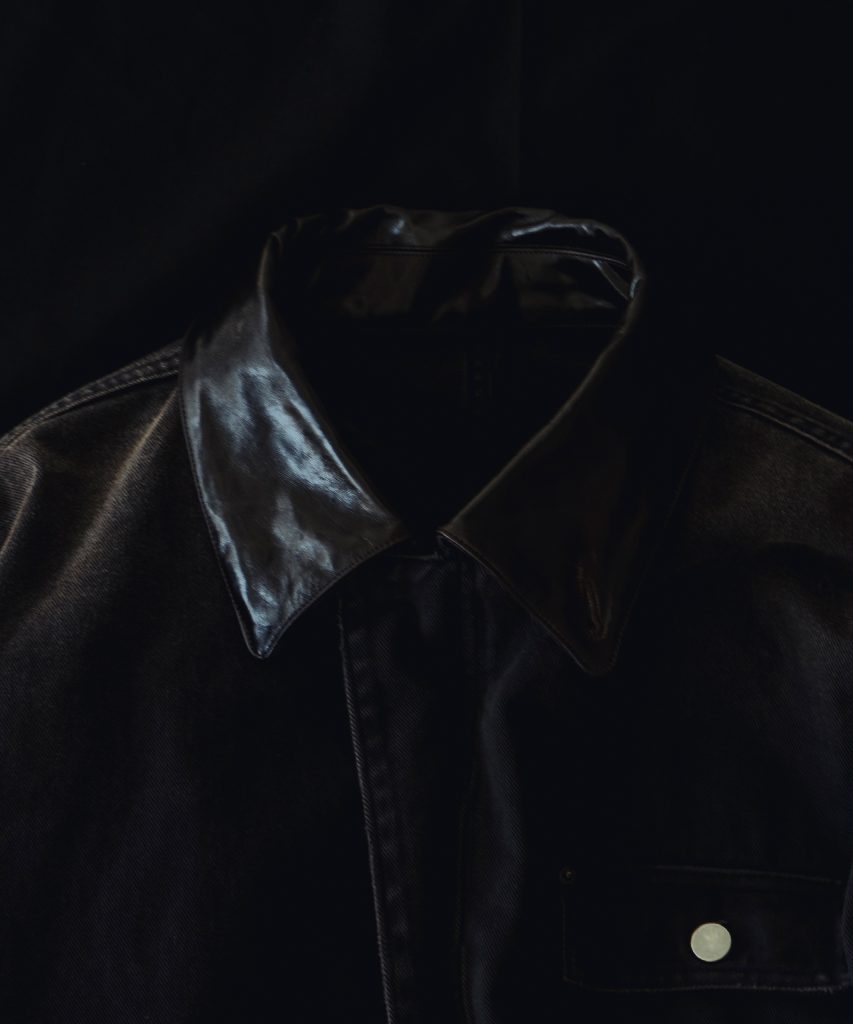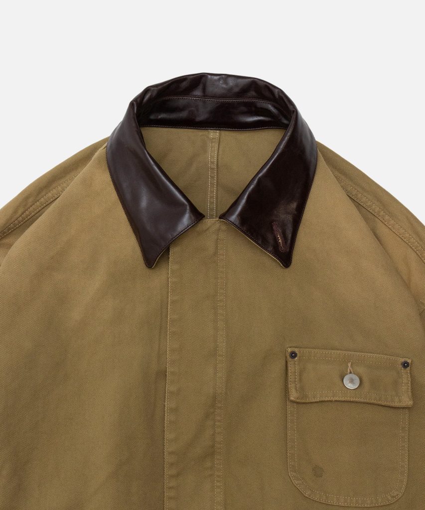 襟には奥行きのあるダークブラウンのカウレザーを採用。