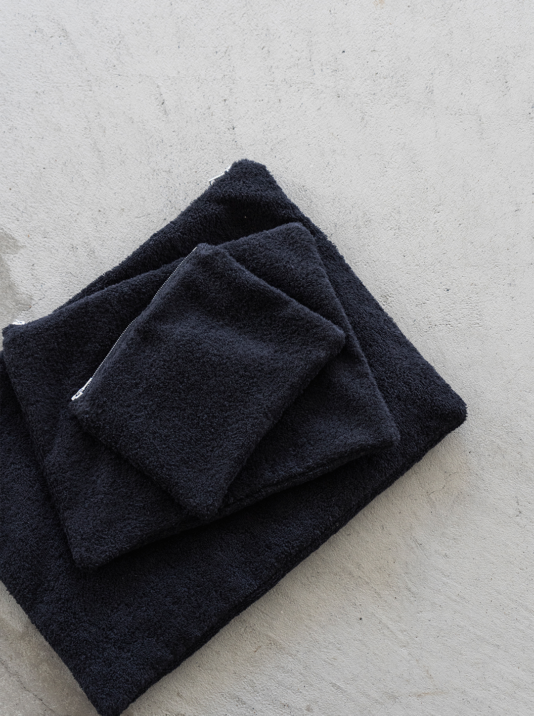 加えて、コットンタオル素材のフラットポーチもサイズ展開豊富に入荷しています。