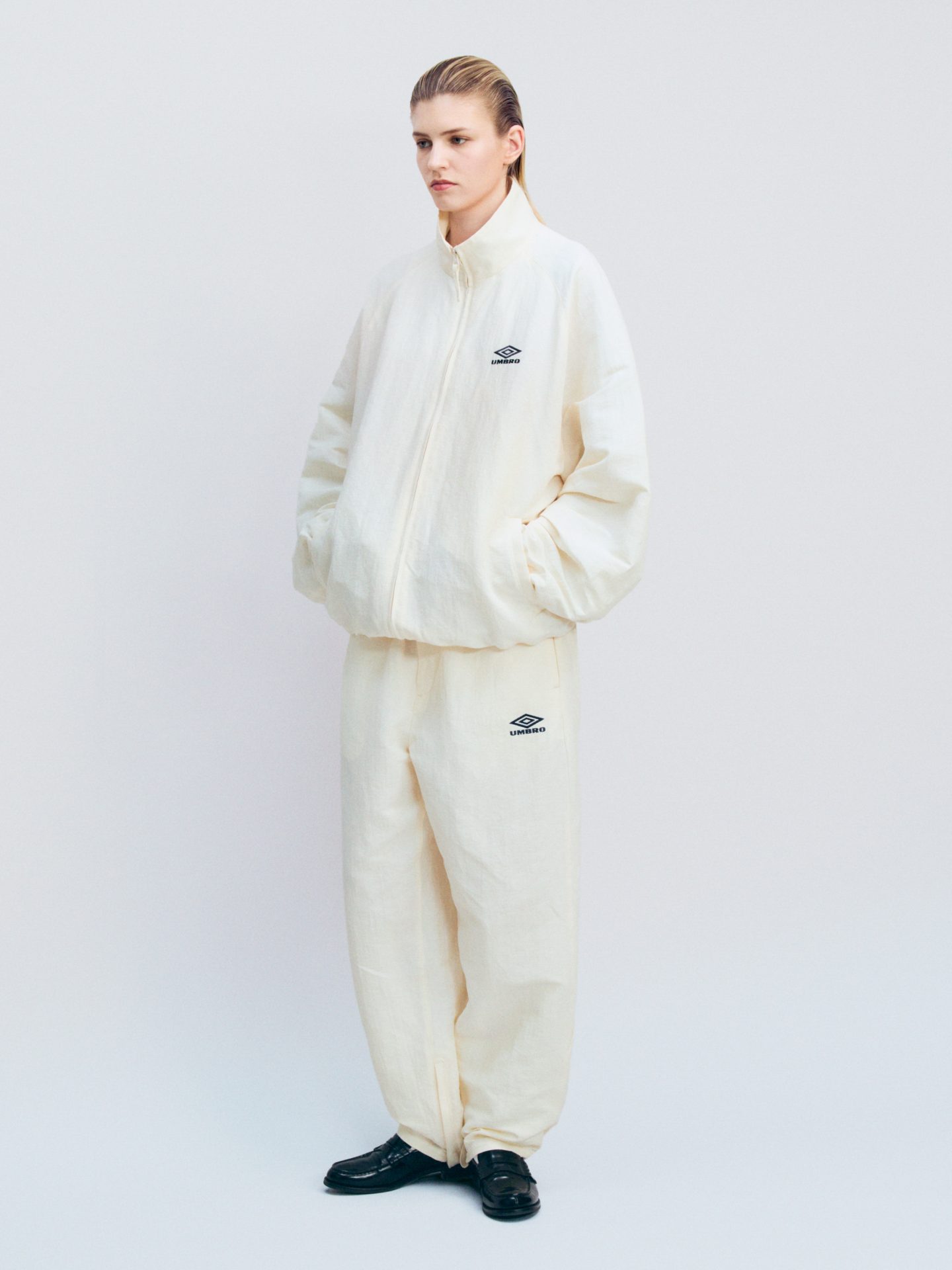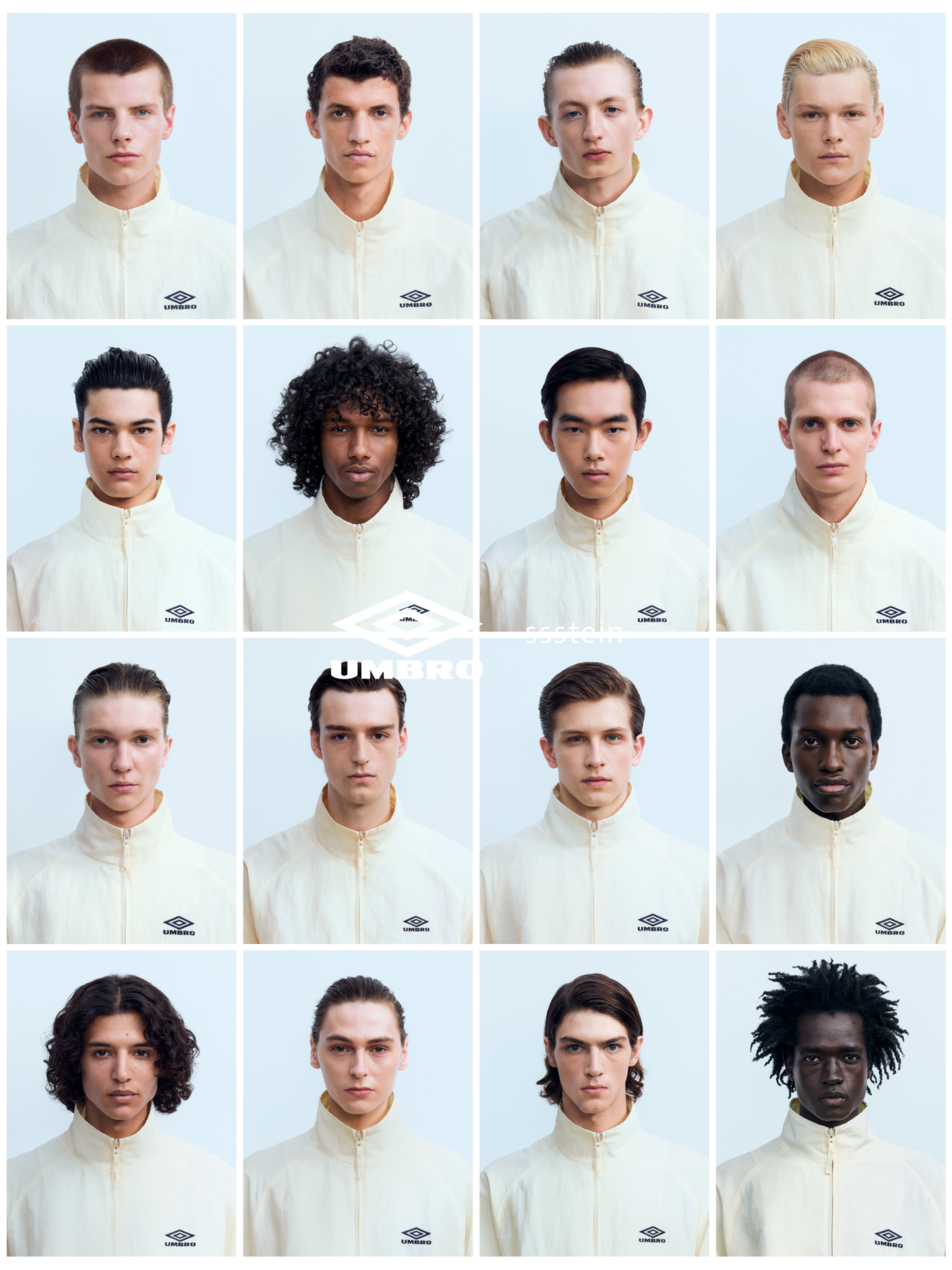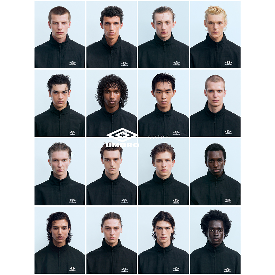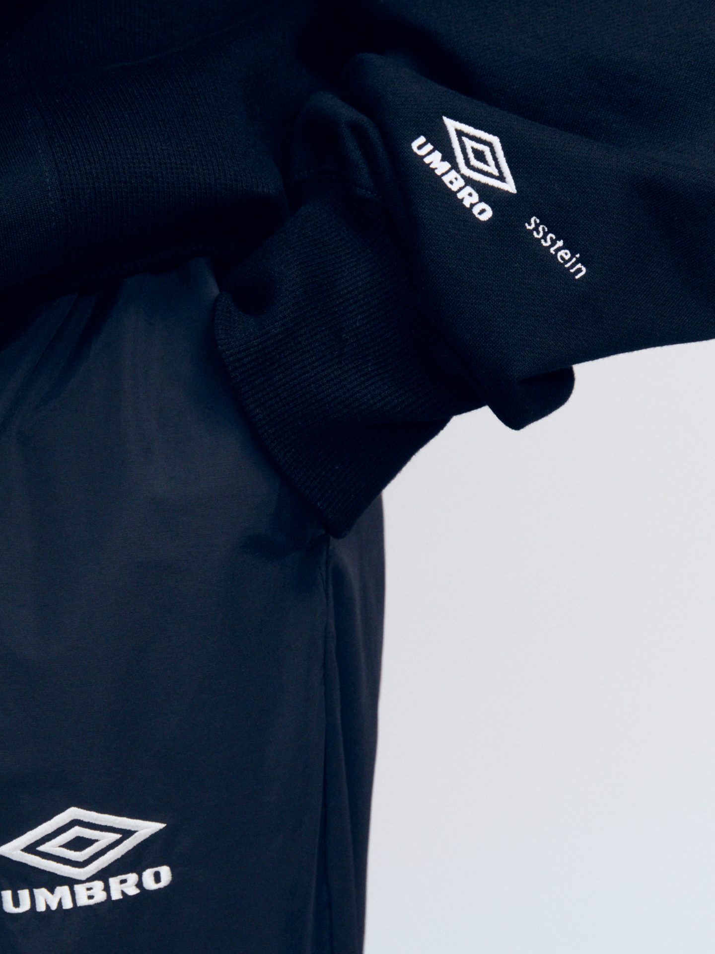 ssstein独自のミニマルなシルエットや素材感に、デザイナーが偏愛する1990年代のUMBROサッカーユニフォームのムードを融合。