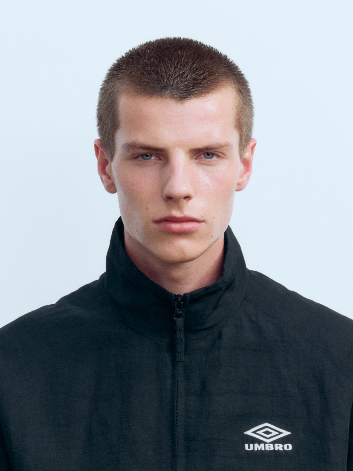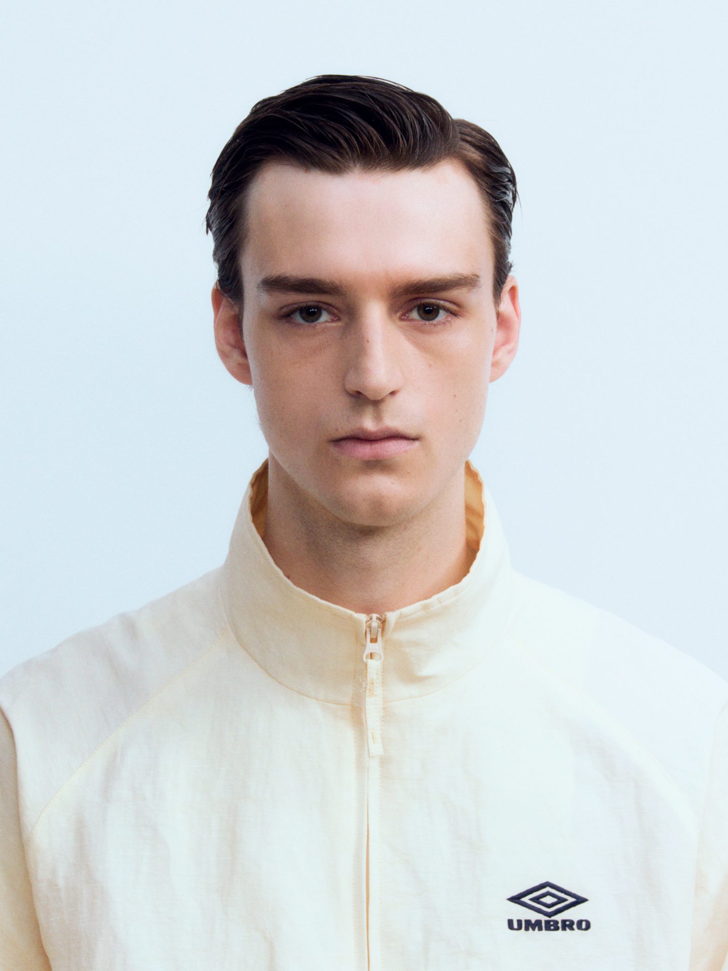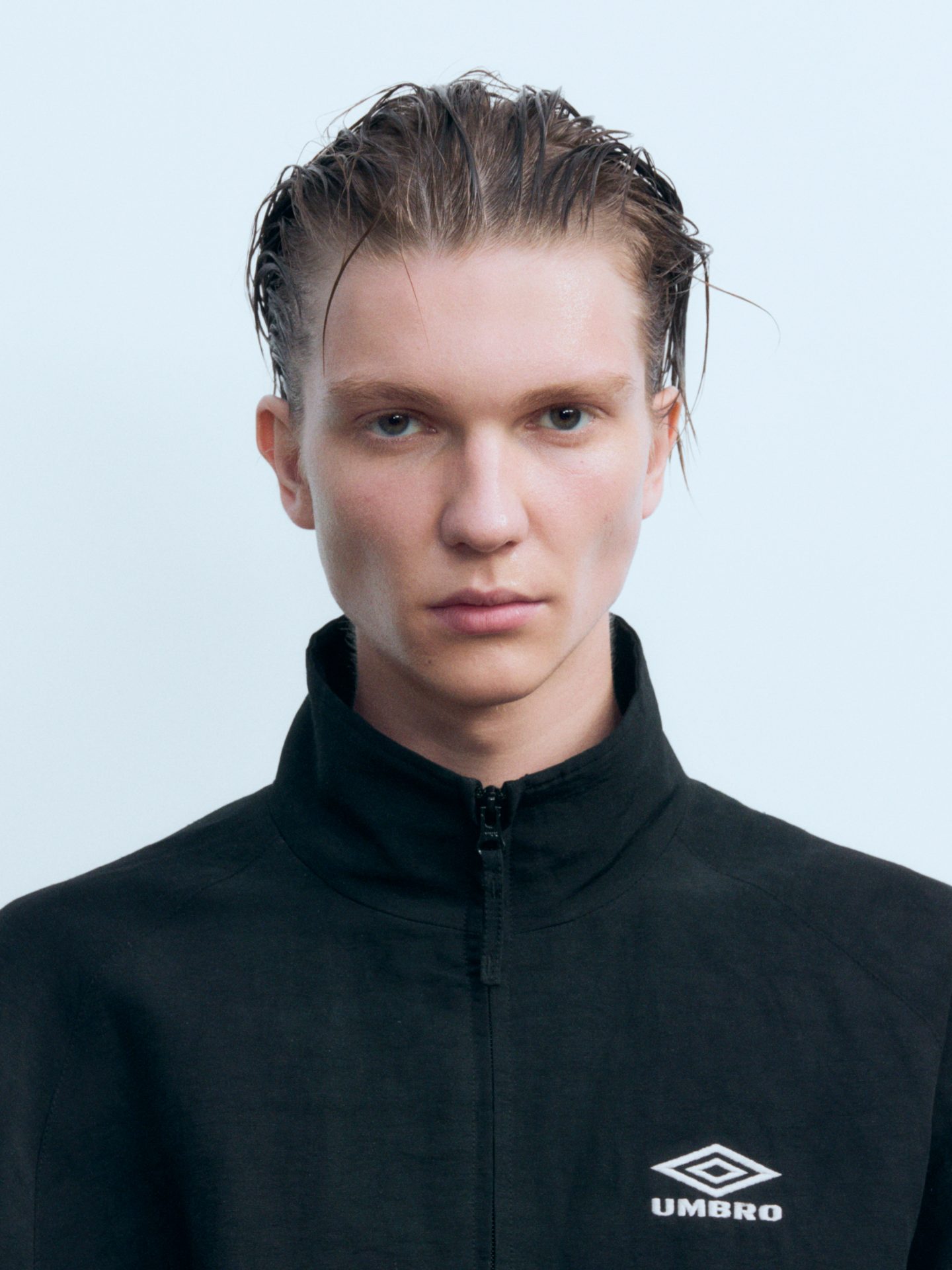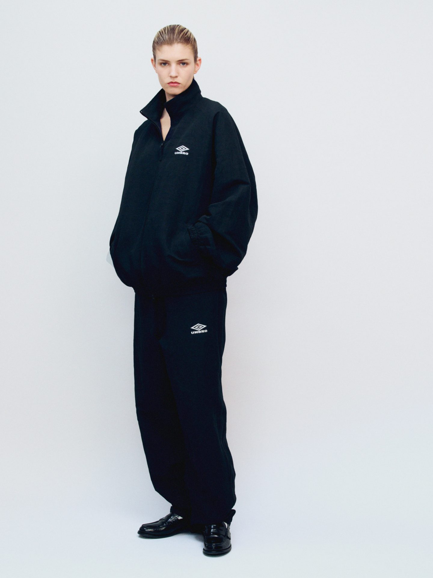 ssstein独自のミニマルなシルエットや素材感に、デザイナーが偏愛する1990年代のUMBROサッカーユニフォームのムードを融合。