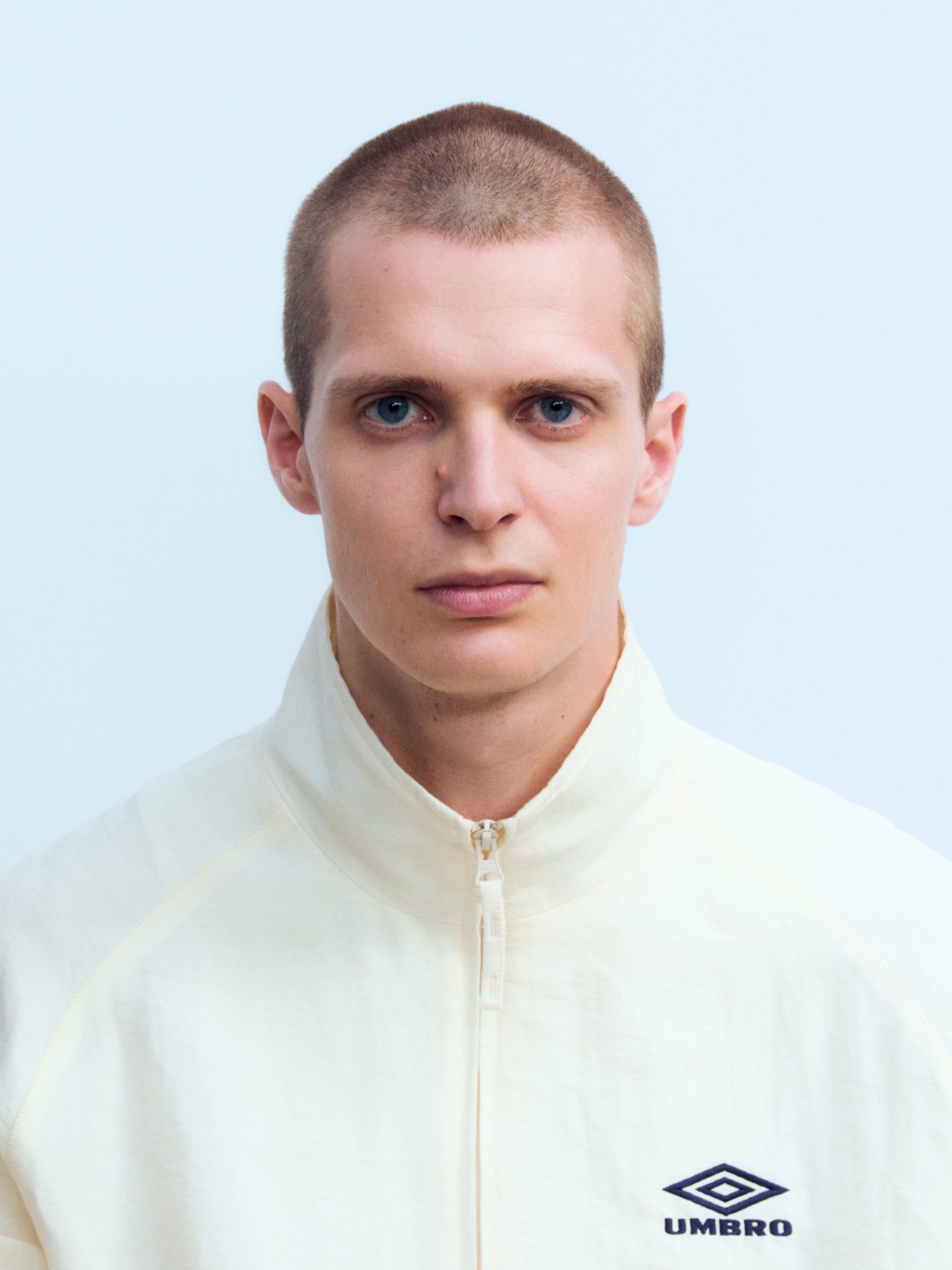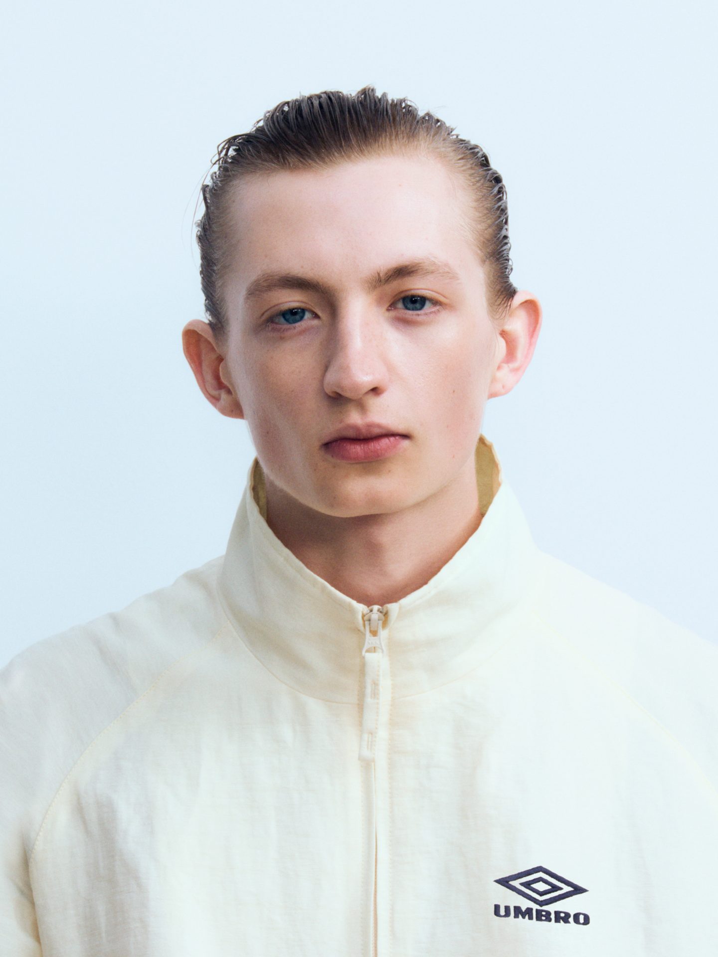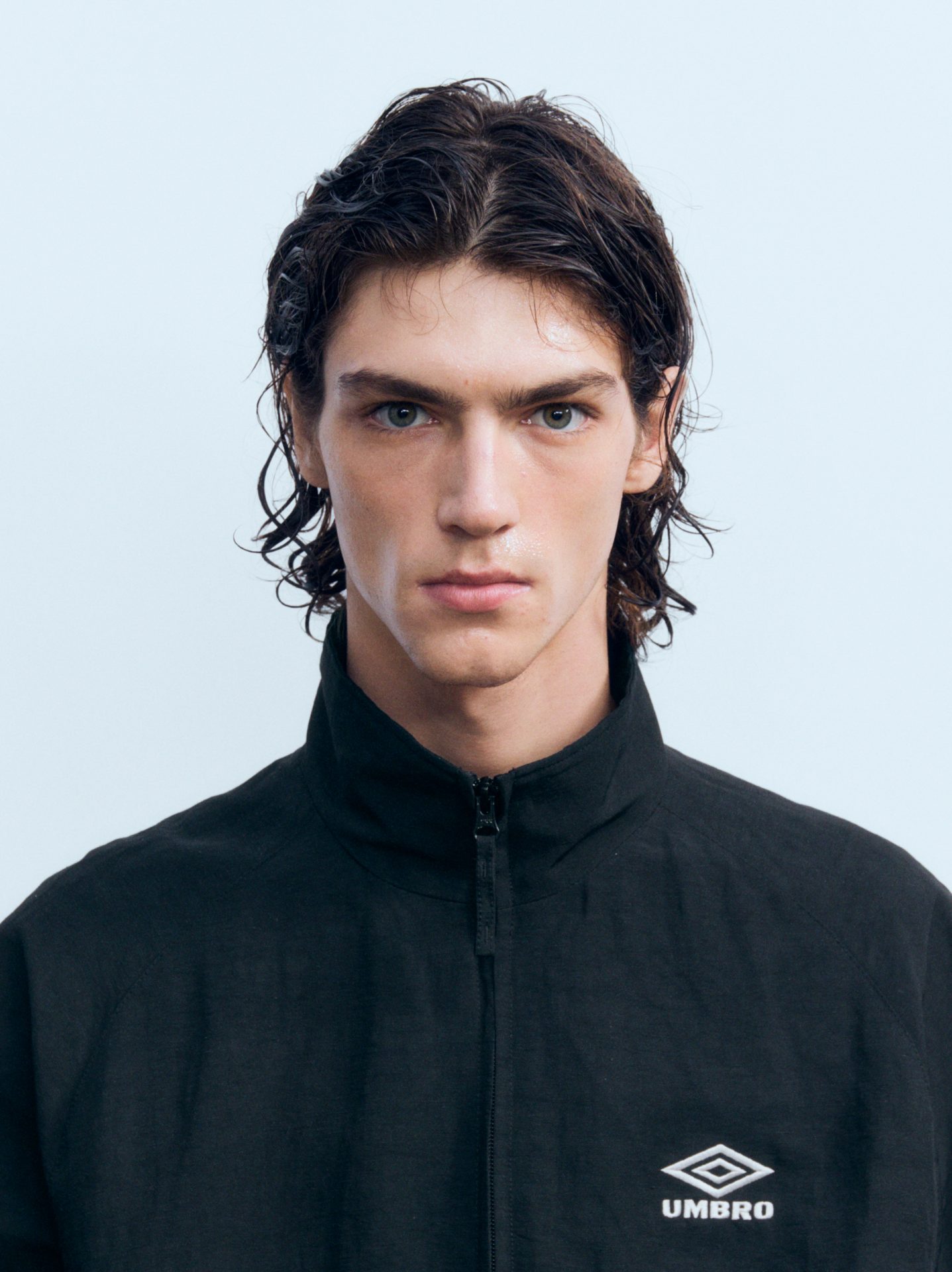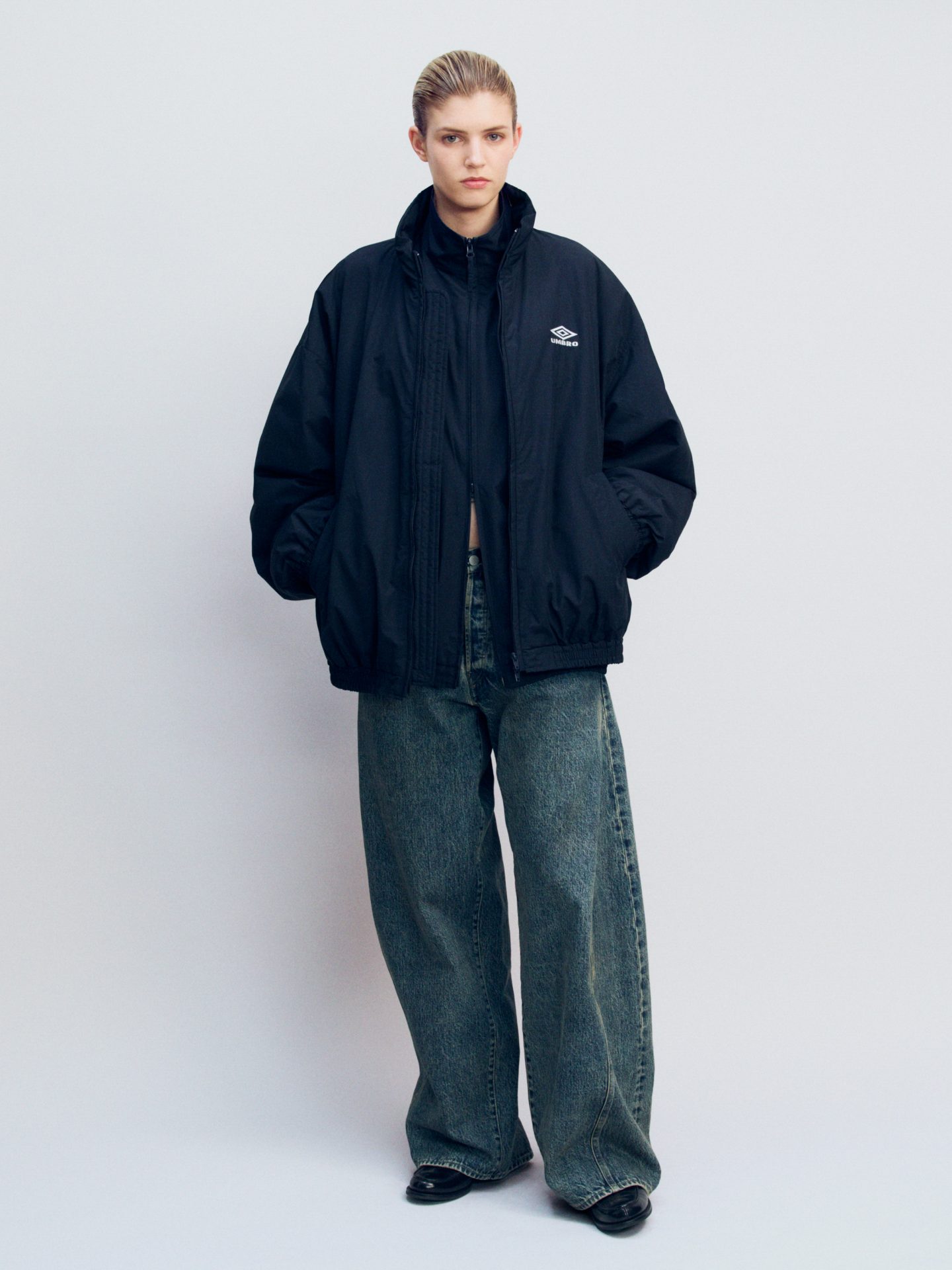 ssstein独自のミニマルなシルエットや素材感に、デザイナーが偏愛する1990年代のUMBROサッカーユニフォームのムードを融合。